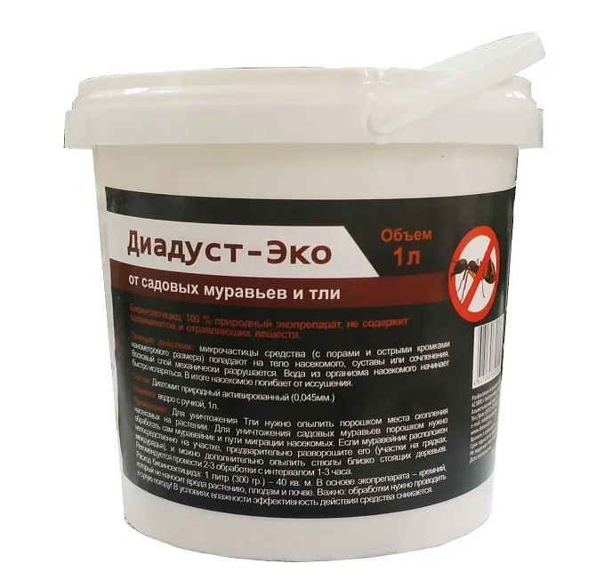 Диадуст-Эко от садовых муравьев и тли - натуральное экологическое средство, не содержит ядохимикатов и отравляющих веществ. Не наносит вреда растениям, а наоборот – при попадании в почву улучшает и кондиционирует ее.