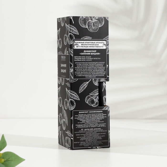 Габариты: 6 x 6 x 21 Страна: Россия В боксе: 10 шт Состав: См. на упаковке Материалы: см. на упаковке Фасовка: по 1 шт Индивидуальная упаковка: Картонная коробка Сертификат: Не подлежит сертификации Объём, мл: 100 Вид ароматизатора: Диффузор Аромат: Вишня Диффузор ароматический BLACK AROMA HOME "Зимняя вишня", 100 мл — тёплый и насыщенный аромат спелой вишни с лёгкой сладостью и пряными акцентами. Он создаёт атмосферу уюта и праздника, наполняя пространство ощущением тепла и гармонии даже в холодное время года. Стильный флакон станет не только источником аромата, но и изысканным элементом интерьера. Способ применения: снимите крышку и поместите в флакон ароматические палочки. Для более интенсивного аромата используйте больше палочек, для лёгкого — меньше. Чтобы освежить звучание, переворачивайте палочки 1–2 раза в неделю. верхние ноты: вишня средние ноты: розовые лепестки базовые ноты: мускус Комментарии к товару