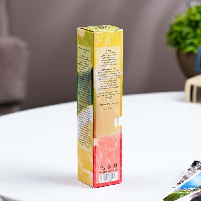 Габариты: 3,5 x 3,5 x 16,5 Страна: Россия В боксе: 12 шт Состав: См. на упаковке Материалы: см. на упаковке Фасовка: по 1 шт Индивидуальная упаковка: Цветная картонная коробка Сертификат: Не подлежит сертификации Объём, мл: 30 Вид ароматизатора: Диффузор Аромат: Цитрус, Грейпфрут