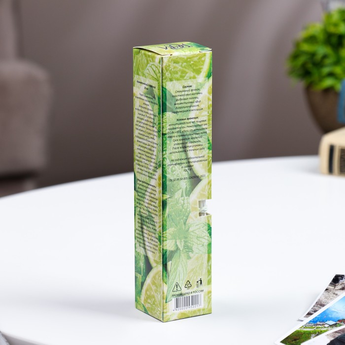 Габариты: 3,5 x 3,5 x 16 Страна: Россия В боксе: 12 шт Состав: См. на упаковке Материалы: см. на упаковке Фасовка: по 1 шт Индивидуальная упаковка: Цветная картонная коробка Сертификат: Не подлежит сертификации Объём, мл: 30 Вид ароматизатора: Диффузор Аромат: Мята, Лайм