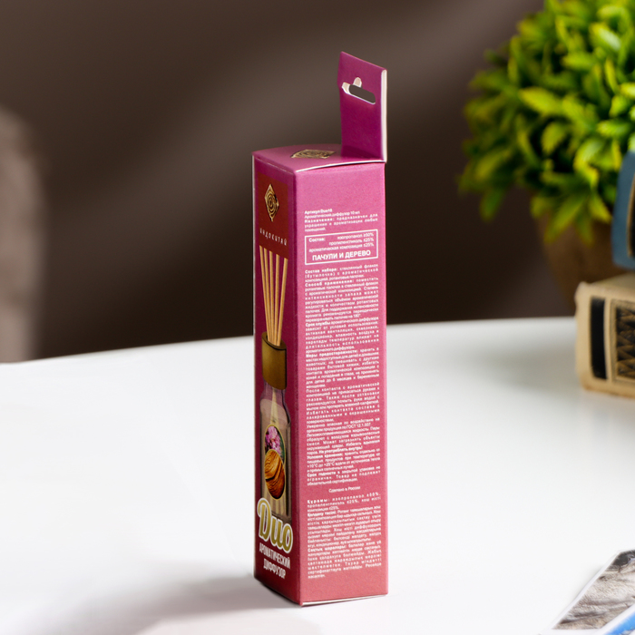 Окунитесь в атмосферу природной глубины с ароматическим диффузором «Пачули и дерево». Тёплые, пряно-землистые ноты пачули сочетаются с благородным древесным акцентом, создавая ощущение уюта, тепла и гармонии. Компактный объём 10 мл идеально подойдёт для небольших помещений — спальни, кабинета, прихожей или зоны отдыха, наполняя их благородным и стойким ароматом.
