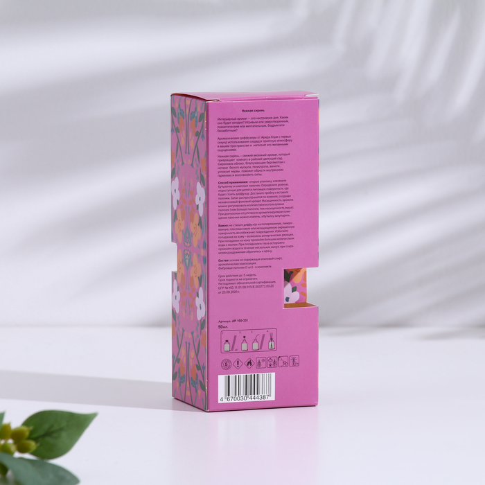 Габариты: 5 x 6 x 15,5 Страна: Россия В боксе: 8 шт Состав: См. на упаковке Материалы: см. на упаковке Фасовка: по 1 шт Индивидуальная упаковка: Картонная коробка Сертификат: Не подлежит сертификации Объём, мл: 50 Вид ароматизатора: Диффузор Аромат: Сирень Ароматический диффузор «Весна» подарит вашему дому свежесть и лёгкость первых весенних дней. Нежный аромат сирени наполняет пространство мягким цветочным шлейфом, создавая атмосферу уюта, гармонии и романтики. Он поможет расслабиться, поднять настроение и сделать каждый день особенным. Компактный флакон объёмом 50 мл удобно разместить в спальне, гостиной или офисе, а ароматические палочки обеспечивают равномерное и длительное распространение аромата на протяжении нескольких недель. Способ применения