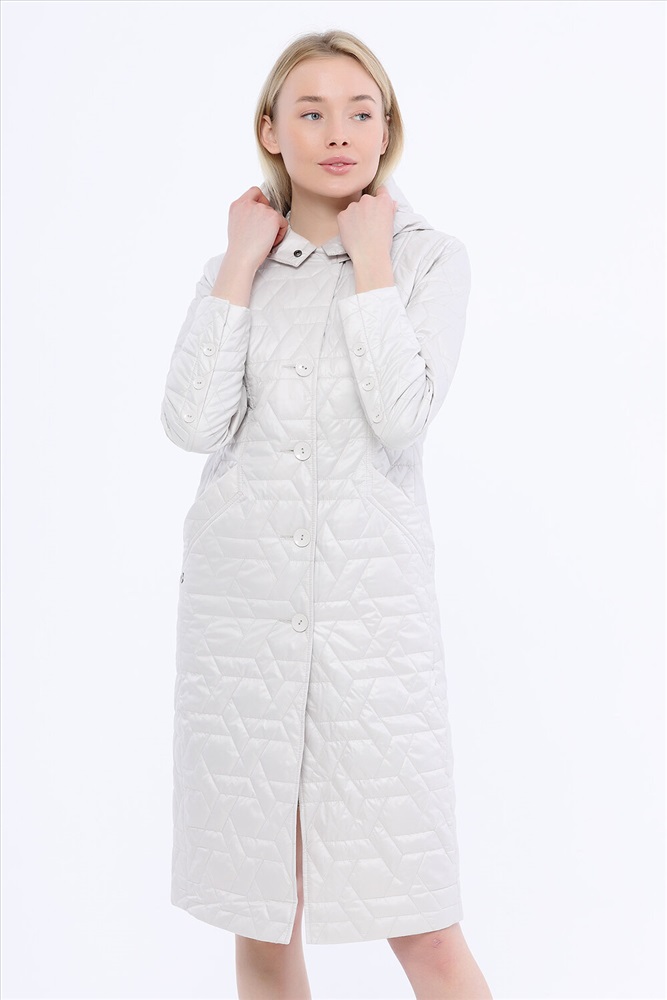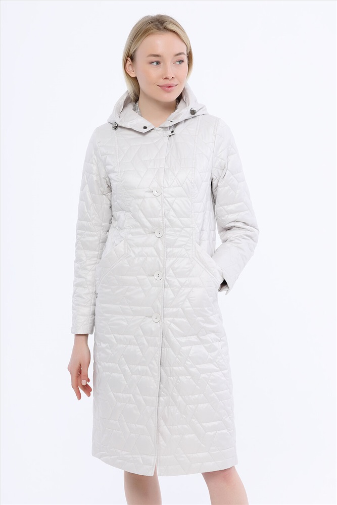 Утепленное пальто российского производства бренда D'imma из стеганной ткани с водоотталкивающей пропиткой. Застежка на пуговицы, декоратиная кнопка у горловины. Капюшон с кулиской, не отстегивается. Декоративные пуговицы на манжетах. Широкий размерный ряд, в наличии большие размеры.