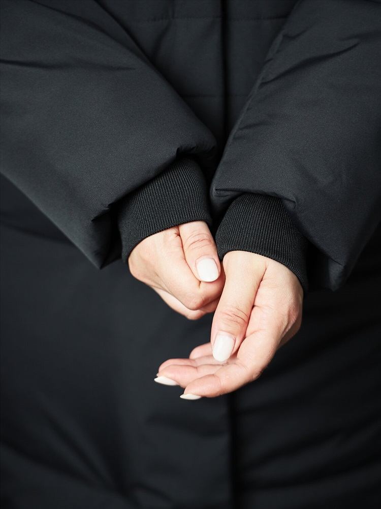 Пальто имеет длинные рукава и капюшон, который можно использовать как потайной карман, что делает его еще более практичным.