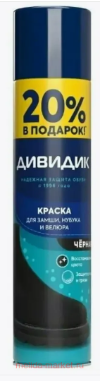 Краска для замши, нубука, велюра ДИВИДИК обновляет и освежает цвет изделий, предохраняет их от намокания, предотвращает образование пятен и солевых разводов.Технология Neutraq: специальный нейтрализатор запаха в составе продукта обеспечивает снижение резкого запаха средства. Специально подобранная распылительная головка обеспечивает более фокусное распыление, снижая вероятность попадания на пол и мебель. Продлите жизнь любимым вещам из кожи, нубука, замши и велюра. Благодаря линейке средств ДИВИДИК любимая пара обуви, куртка, сумка или любая верхняя одежда дольше сохранит свой привлекательный внешний вид и будет радовать не один сезон! Комментарии к товару