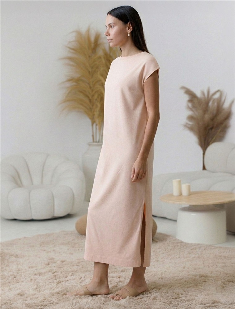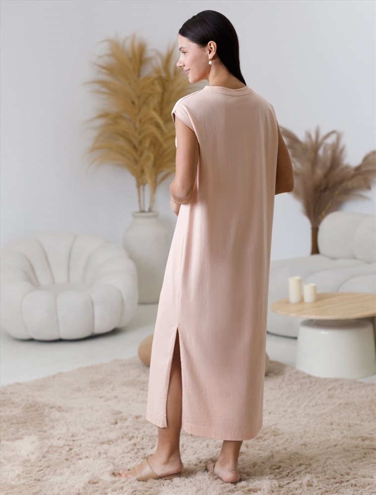 Состав: 100%Хлопок; Плотность: 140 Г/м2 Стильное базовое платье пудрового цвета длины макси выполнено из 100% хлопка плотностью 140 Г/м2. Главная особенность этого изделия — тонкое кулирное полотно, которое легче и воздушнее стандартного трикотажа. Благодаря своей деликатной текстуре модель идеально подходит для домашних образов и пижамных комплектов. Ткань отлично «дышит», обеспечивая максимальный уют во время сна и отдыха. Свободный и прямой крой не сковывает движений и легко скроет возможные недостатки фигуры., а разрезы добавляют легкости и непринужденности образу. Короткий цельнокроеный рукав и позволяет чувствовать себя удобно в теплую погоду, а так же в домашней обстановке. Простота кроя сочетается с современным дизайном, создавая гармоничный лук без излишеств. Это легкое платье подойдет для тех, кто ценит комфорт и элегантность одновременно.