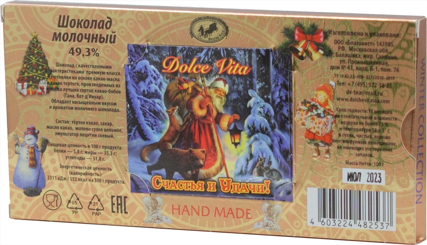 Молочный шоколад в подарочной новогодней упаковке. С коллекционным магнитом.Производство основано на классическом рецепте молочного шоколада. Только какао, молоко и сахар. Ничего лишнего! Максимум пользы и вкуса в одной плитке. Мы используем отборные какао-бобы лучших сортов премиум-класса, выращенных в Кот-д'Ивуаре. Именно эти бобы максимально раскрывают вкус и аромат настоящего шоколада. А молочные продукты делают его более сливочным и нежным. Молочный шоколад от Dolche Vita — это вкус, знакомый с детства!