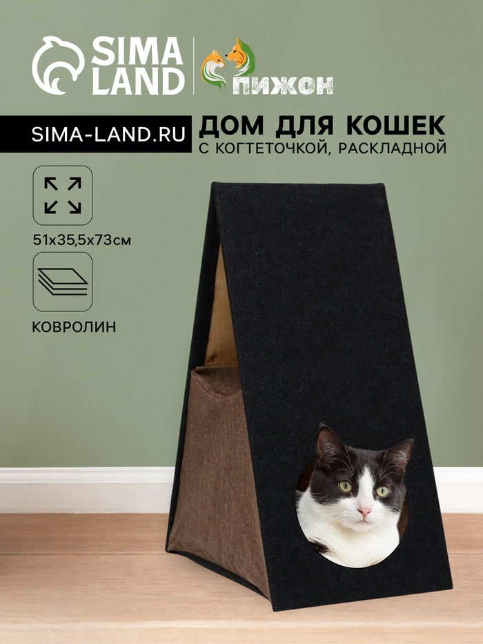 Домик высотой 73 см обеспечивает достаточно пространства для отдыха и игр вашего питомца, а встроенная когтеточка защитит мебель от когтей, позволяя кошке безопасно удовлетворять свои естественные потребности. Удобный раскладной дизайн делает домик мобильным и легким в хранении, а прочные материалы, такие как ДСП и ковролин, гарантируют долгий срок службы.