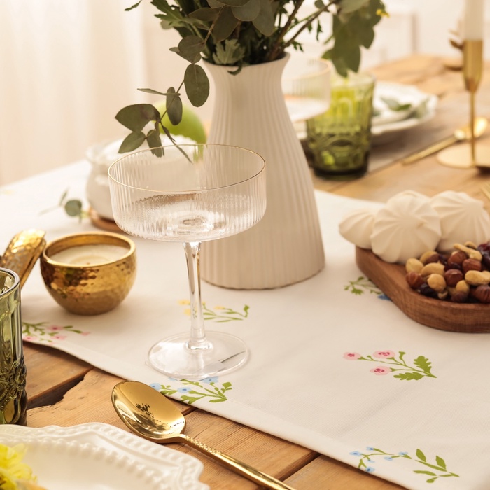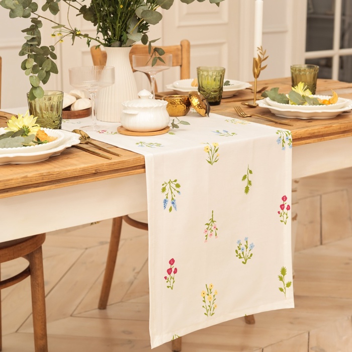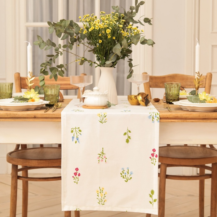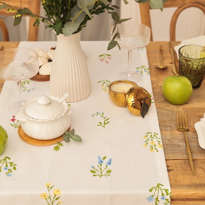 Повседневный комфорт и праздничный вид Плотная хлопковая саржа хорошо держит форму и устойчива к частым стиркам. Дорожка защищает поверхность стола, добавляя сервировке завершённость. Нежный растительный орнамент делает её универсальным выбором — от ежедневных завтраков до особых чаепитий. Это продуманный подарок, который приносит в дом тепло и стиль. Комментарии к товару