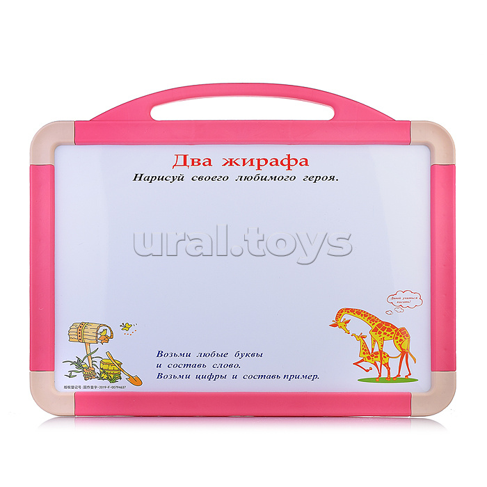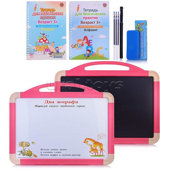 Код: 503405 Штрихкод: 6933117847203 Страна производитель: Китай Размеры упаковки: 47 x 45 x 3 см Количество в коробке: 24 • Двухсторонняя доска: одна сторона для рисования мелом. другая магнитно-маркерная. • Размеры доски: 46х37 см. • Размеры рабочей поверхности: 40.5х27 см. • Материал: пластик. • В комплекте: 2 белых мелка, губка для стирания, маркер, шариковая ручка, 2 блокнота для дошкольных занятий. Комментарии к товару