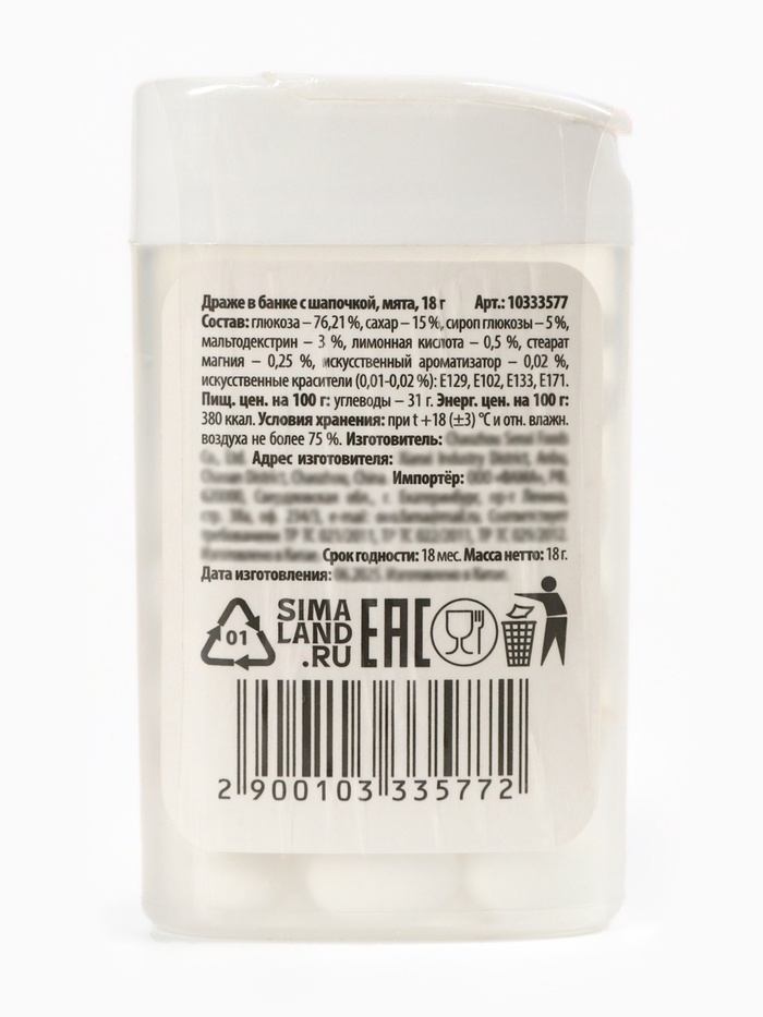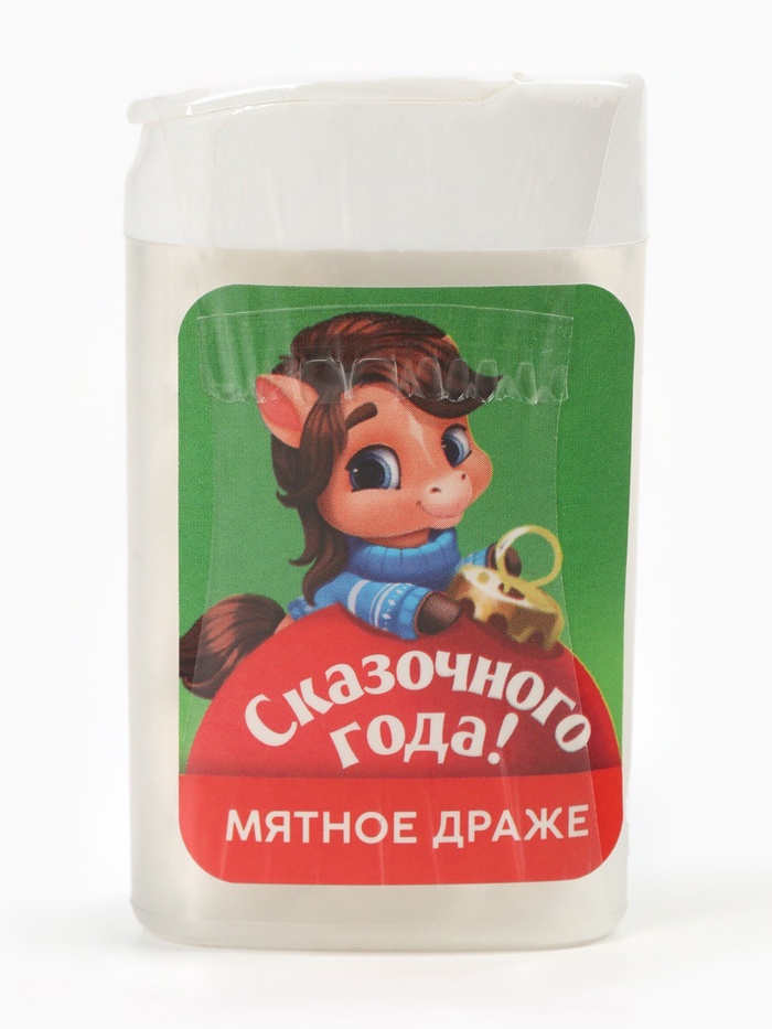 Габариты: 9 x 4 x 2 Страна: Китай В боксе: 500 шт Состав: См. на упаковке Материалы: см. на упаковке Фасовка: по 10 шт Индивидуальная упаковка: Термоусадочная пленка Габариты товара: 6,4 см × 3,6 см × 1,7 см Сертификат: ЕАС Набор: Нет Вес нетто, г: 18 Вид упаковки: Банка Символ года: Символ года 2026 (Лошадь) Тематика праздника: Новый год Вкус: Мята Вид: Драже Темпер. ограничение НЕ ВЫШЕ ℃: +25 При оформление заказа, просим запрашивать актуальные сроки годности у менеджера Состав: глюкоза 76,21 %, сахар 15 %, сироп глюкозы 5 %, мальтодекстрин 3 %, лимонная кислота 0,5 %, стеарат магния 0,25 %, искусственный ароматизатор 0,02 %, искусственные красители 0,01-0,02 % E129, E102, E133, E171. Срок годности: 15 месяцев. Масса нетто: 18 г. Комментарии к товару