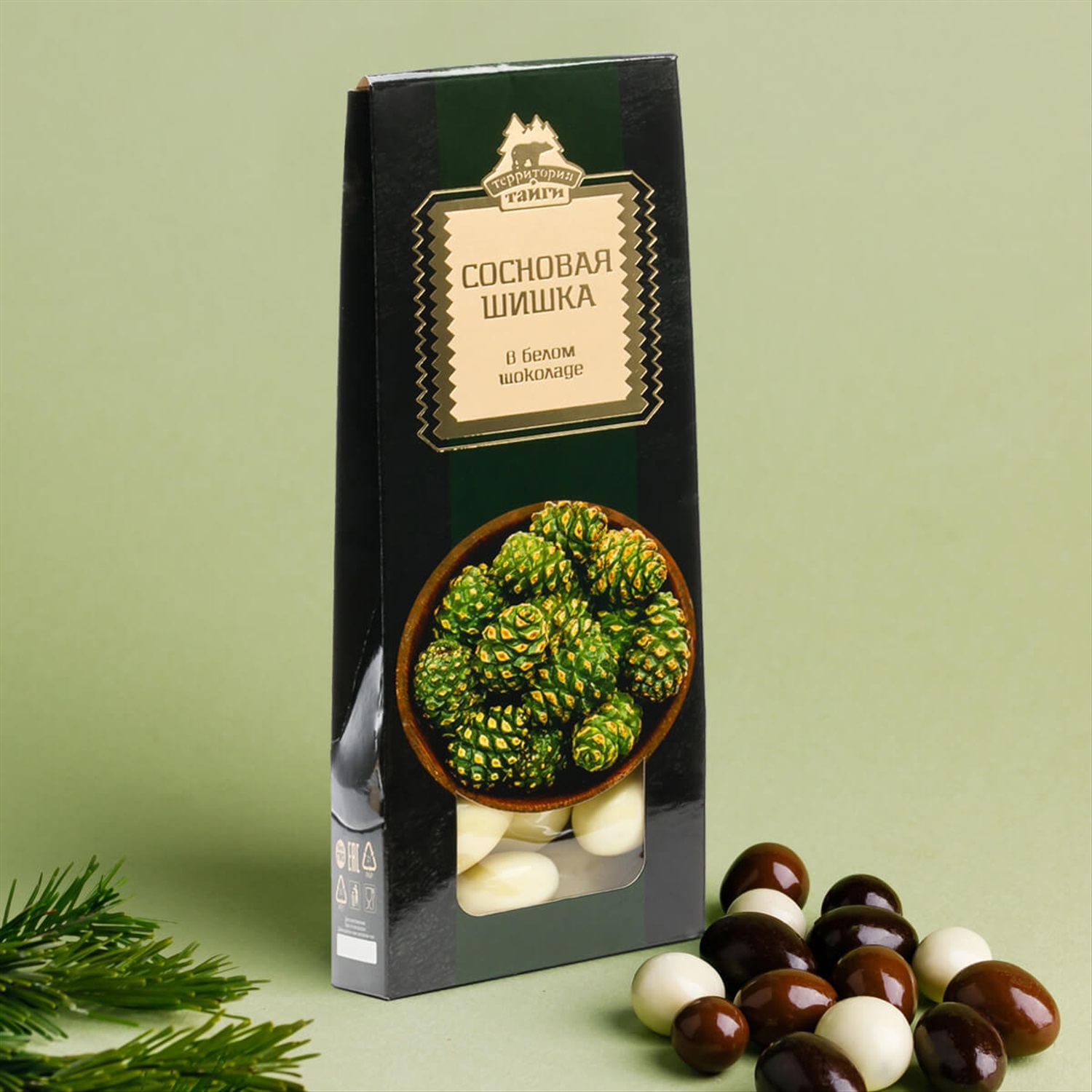 Белки, г/100 г: 1 Углеводы, г/100 г: 73 Жиры, г/100 г: 5 Состав: молодые сосновые шишки, белый шоколад (сахар, масло какао, сухое цельное молоко, сухая молочная сыворотка, эмульгатор соевый лецитин, натуральный ароматизатор "Ваниль"), сахар, глазирователь (натуральная пищевая добавка гуммиарабик, сироп глюкозы, растительное масло), глянцеватель (натуральная пищевая добавка шеллак, растительное масло). Торговая марка: Территория Тайги Энергетическая ценность, ккал/100 г: 340 Упаковка: Картон-домик Срок годности в мес.: 12 Условия хранения: Хранить при температуре (18±3)°С и относительной влажности воздуха не более 75% Штрих-код товара: 4631149898553 Вес нетто товара, г: 100 Габариты товара ШхГхВ, см: 7х4х18,5 Вес брутто товара, г: 120 Производитель: Левихина А.В. ИП Количество товара в групповой упаковке, шт: 12 Описание