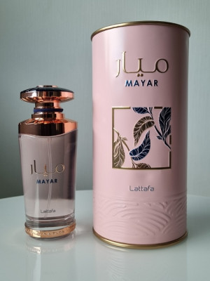 Mayar Lattafa Perfumes — это аромат для женщин, он принадлежит к группе цветочные фруктовые. Это новое издание: Mayar выпущен в 2022 году. Верхние ноты: Личи, Малина и Лист фиалки; средние ноты: Белая роза, Пион и Жасмин; базовые ноты: Мускус и Ваниль.