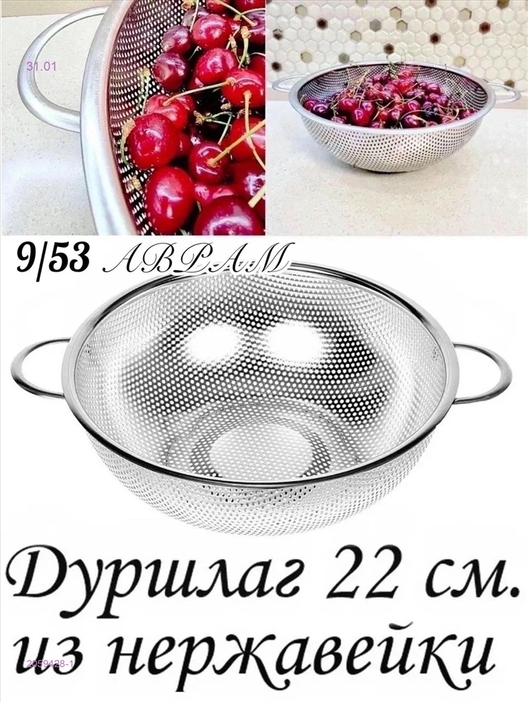 Дуршлаг изготовлен из нержавеющей стали, удобен и практичен в использовании т.к. дуршлак оснащён двумя удобными приваренными ручками, диаметр дуршлага на выбор 22 сантиметра, посуда оптимальна для использования, поставить в мойку, раковину, сито станет незаменимым помощником каждой хозяйке в дом или на дачу, которая любит и умеет готовить! Материал нержавеющая сталь 18/10 Инвентарь друшлаг для кастрюли можно использовать под промывку пасты макарон, риса, нута, гречки, гороха, клубники, черешни, булгура, фруктов, ягод, овощей, фруктов, грибы. Сетка имеет перфорацию отверстий, жидкость проливается через продукты и сливается в раковину.
