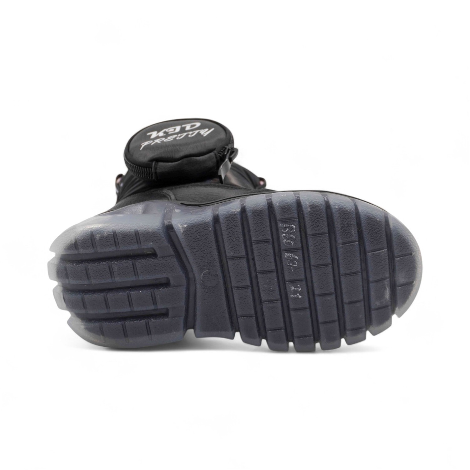 Материал: Верх обуви выполнен из непромокаемого текстиля, что обеспечивает надежную защиту от снега и влаги. Вставки из экокожи дополнительно защищают мысок и пятку сапожек от механических повреждений.