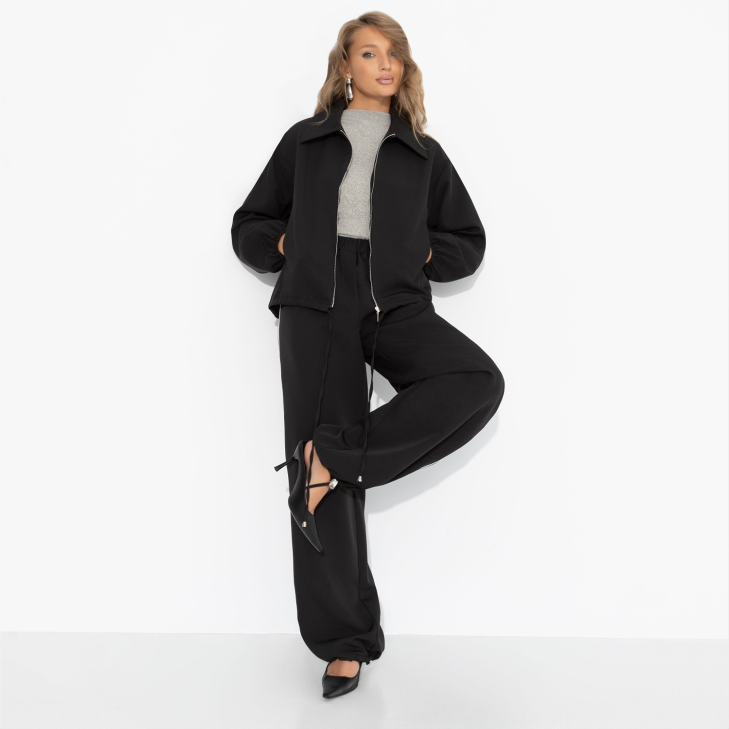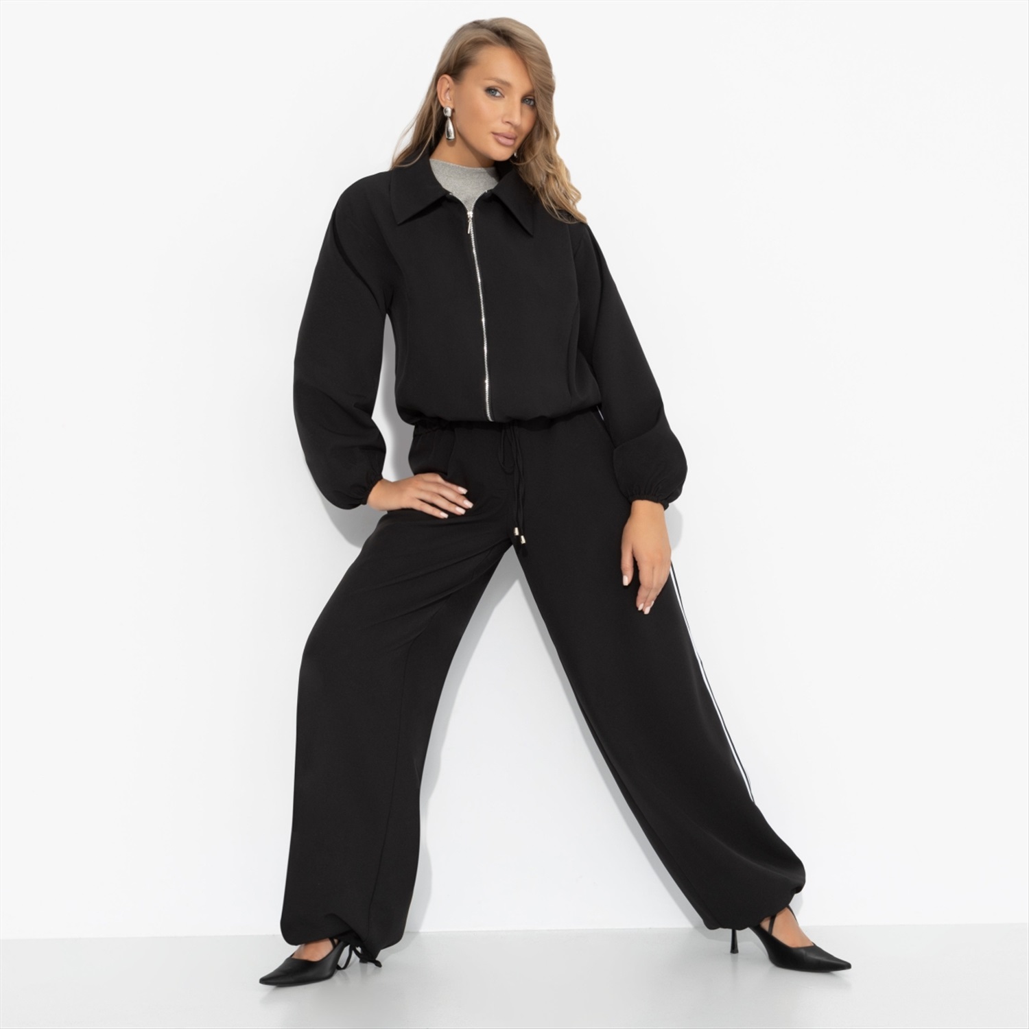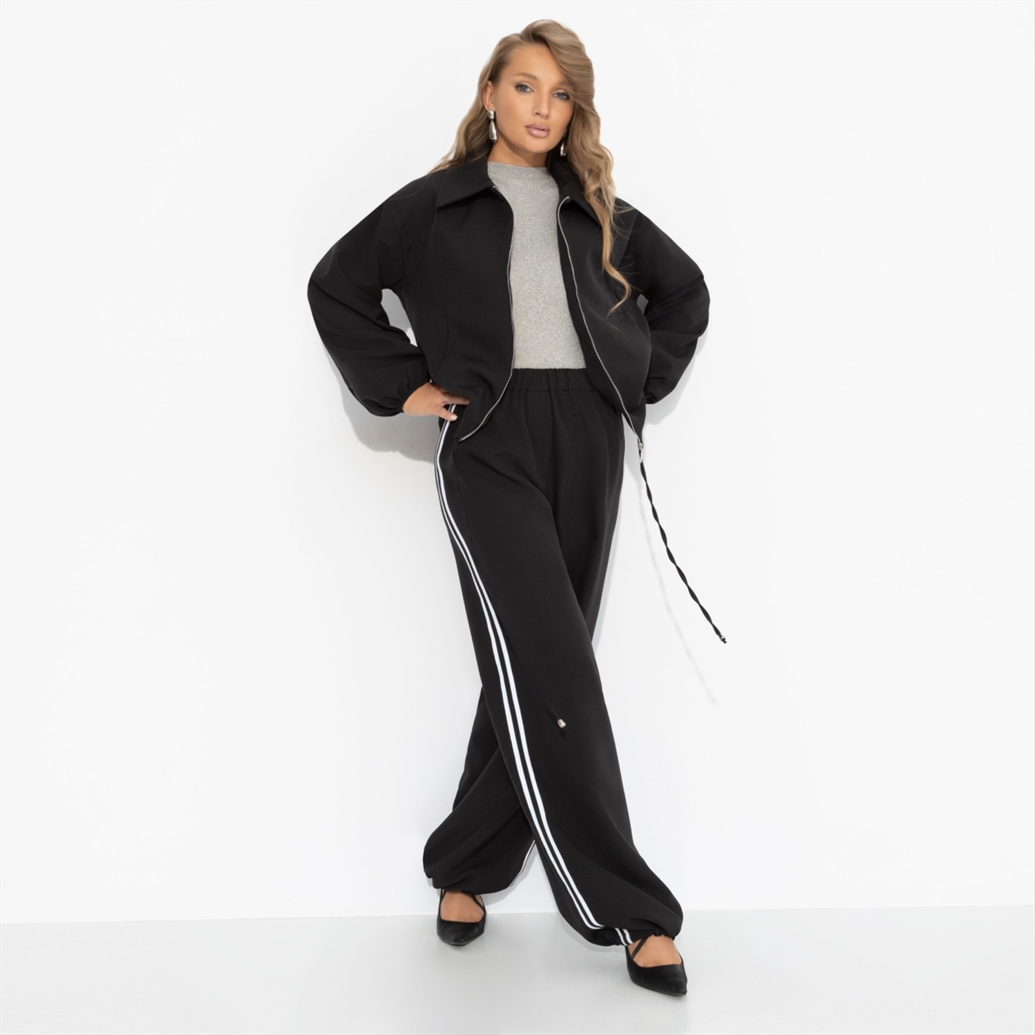 Состав: Костюмная ткань «барби» (95% п/э, 5% эластан) Плотность ткани: Средняя Тип ткани: Текстиль Вид застежки: Молния Декоративные элементы: Лампасы Карманы: В боковом шве Основной цвет ткани: Черный Отрезная талия: Есть Подклад: Нет Резинка по талии: Есть Рисунок/раппорт: Нет, все изделия идентичны Сезон: Демисезон Силуэт: Свободный Формула городского кэжуала. Свободная черная куртка-бомбер на молнии и брюки-алладины создают струящийся силуэт с расслабленной посадкой. Такой комплект отлично подходит для активного дня в мегаполисе – почувствуйте уверенность, не жертвуя комфортом. Лаконичные линии и универсальный чёрный цвет создают тысячи комбинаций для стильных выходов, от встречи в кафе и прогулки на детской площадке до галереи современного искусства. Комментарии к товару