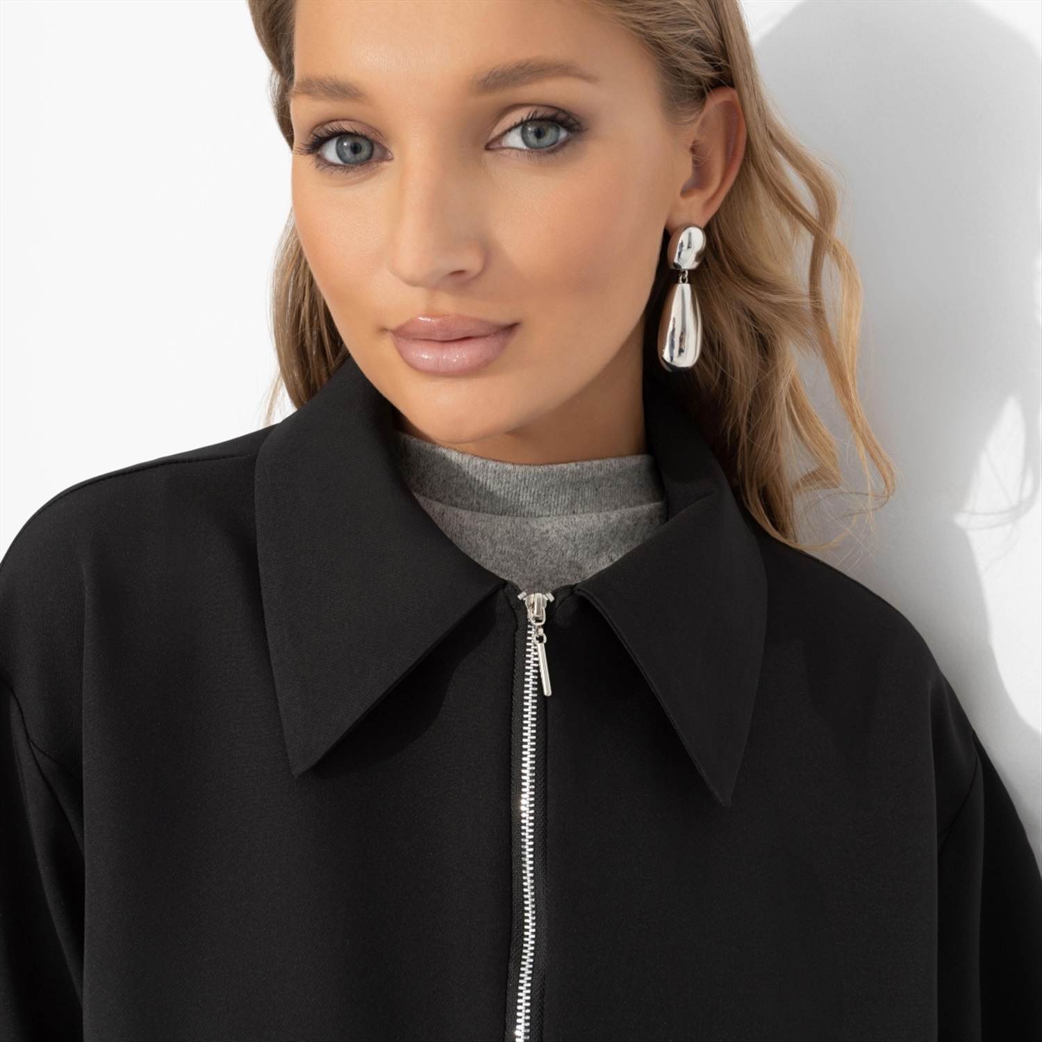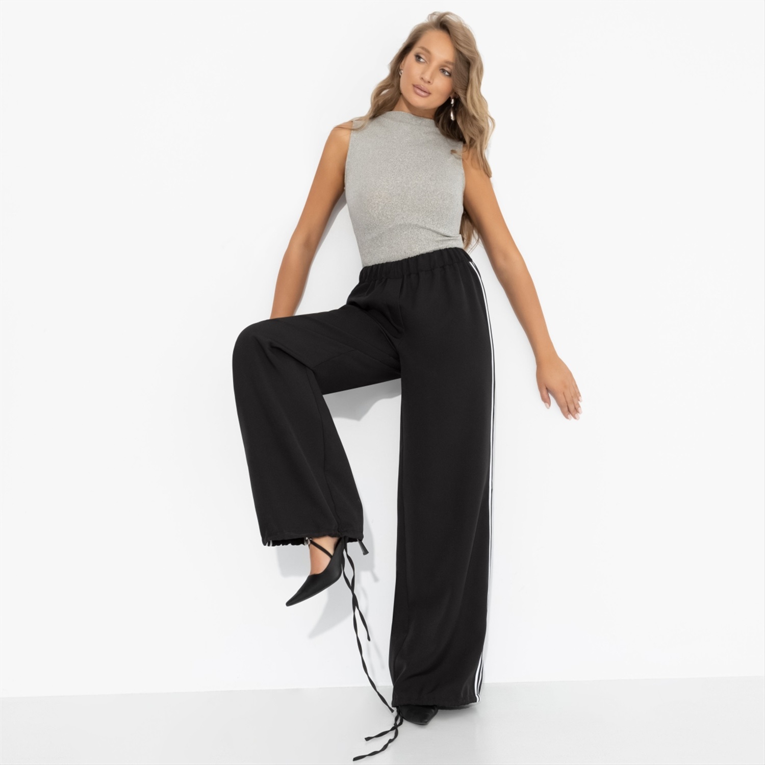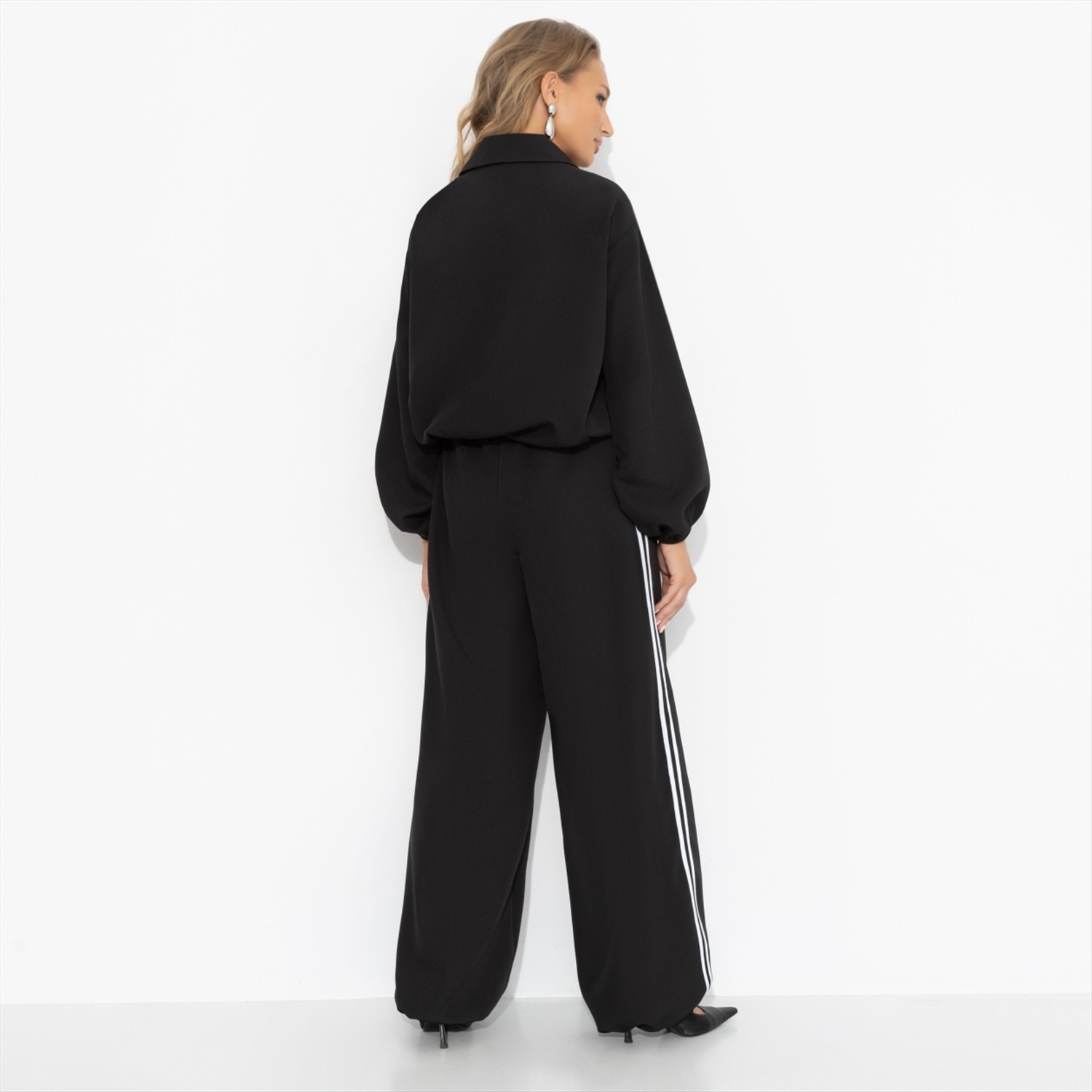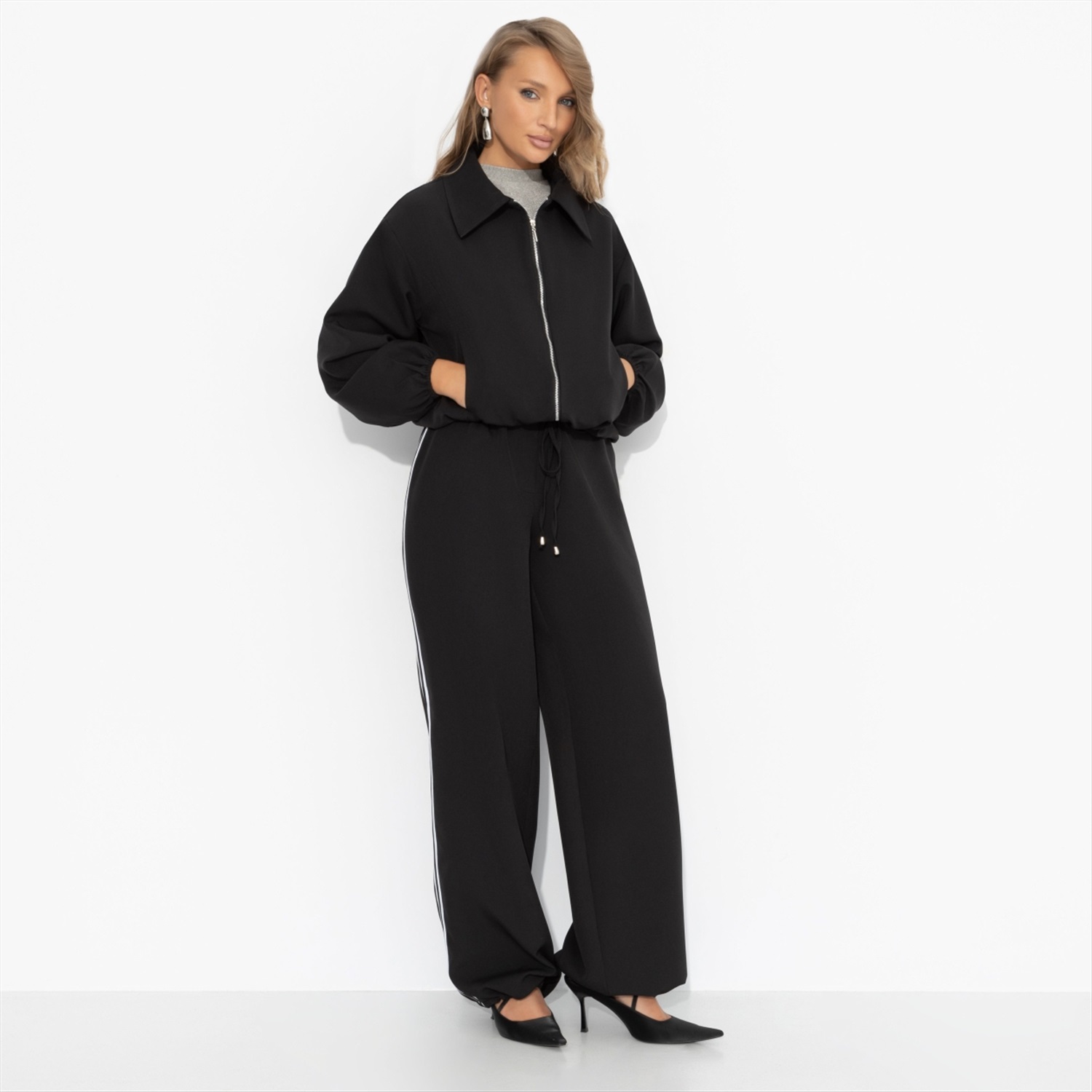 Состав: Костюмная ткань «барби» (95% п/э, 5% эластан) Плотность ткани: Средняя Тип ткани: Текстиль Вид застежки: Молния Декоративные элементы: Лампасы Карманы: В боковом шве Основной цвет ткани: Черный Отрезная талия: Есть Подклад: Нет Резинка по талии: Есть Рисунок/раппорт: Нет, все изделия идентичны Сезон: Демисезон Силуэт: Свободный Формула городского кэжуала. Свободная черная куртка-бомбер на молнии и брюки-алладины создают струящийся силуэт с расслабленной посадкой. Такой комплект отлично подходит для активного дня в мегаполисе – почувствуйте уверенность, не жертвуя комфортом. Лаконичные линии и универсальный чёрный цвет создают тысячи комбинаций для стильных выходов, от встречи в кафе и прогулки на детской площадке до галереи современного искусства. Комментарии к товару
