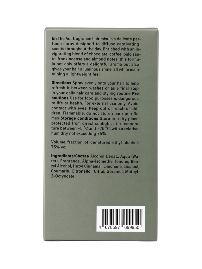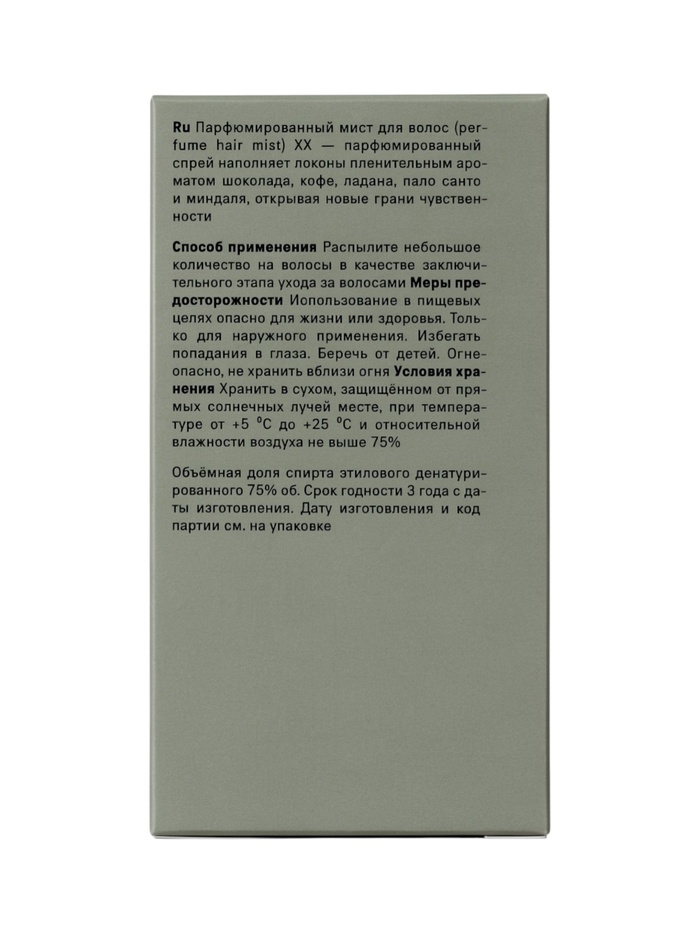 Габариты: 10,5 x 5,5 x 5,5 Страна: Россия В боксе: 35 шт Состав: См. на упаковке Материалы: см. на упаковке Фасовка: по 1 шт Индивидуальная упаковка: Без упаковки Сертификат: ЕАС Вес, г/Объём, мл: 50 Темпер. ограничение НЕ НИЖЕ ℃: 0 Парфюмированный спрей для волос XX окутывает локоны пленительным ароматом шоколада, кофе, ладана, пало санто и миндаля, создавая атмосферу чувственности и утончённой роскоши. Лёгкая невесомая текстура спрея позволяет равномерно распределять аромат по волосам, не утяжеляя их, а насыщенная композиция раскрывается постепенно, раскрывая новые грани обаяния и глубины. XX — это не просто аромат, это эмоциональное путешествие: тёплые ноты шоколада и кофе дарят уют и комфорт, древесные акценты ладана и пало санто придают загадочность и магнетизм, а миндальные ноты добавляют лёгкость и мягкость. Дымка идеально подходит для повседневного использования, делая волосы ароматным аксессуаром вашего образа, а также может быть распылена на тело для создания гармоничного парфюмерного шлейфа. Способ применения Распылите небольшое количество спрея на волосы и тело, удерживая флакон на расстоянии 15–20 см. Используйте в течение дня для поддержания свежести и аромата. Состав Денатурированный спирт, вода, отдушка, альфа-изометил ионон, бензиловый спирт, гексил циннамал, лимонен, линалоол, кумарин, цитронеллол, цитраль, гераниол, метил 2-октиноат. Комментарии к товару