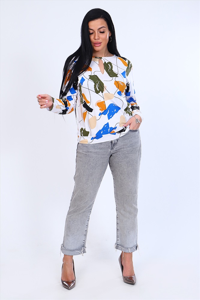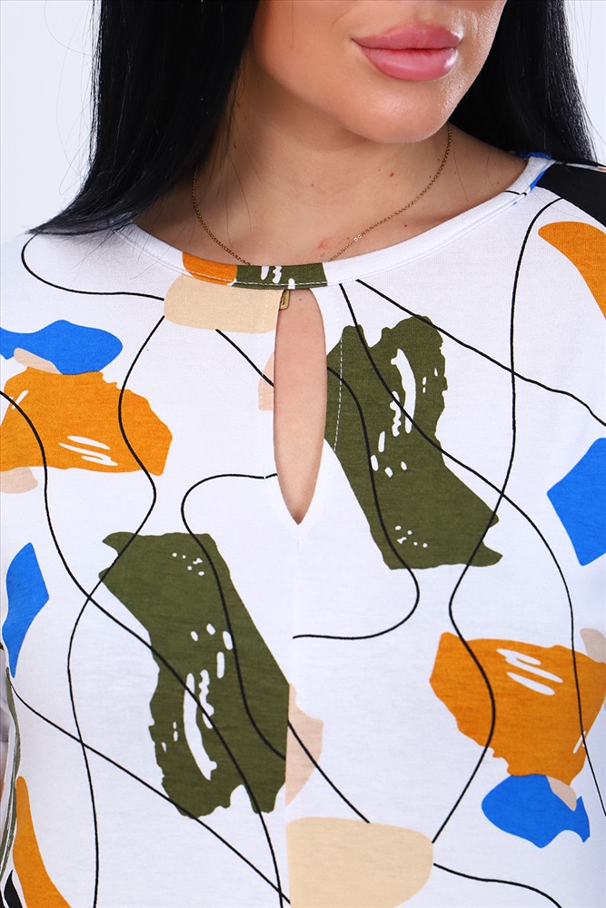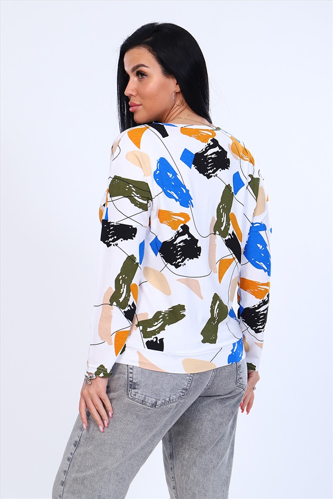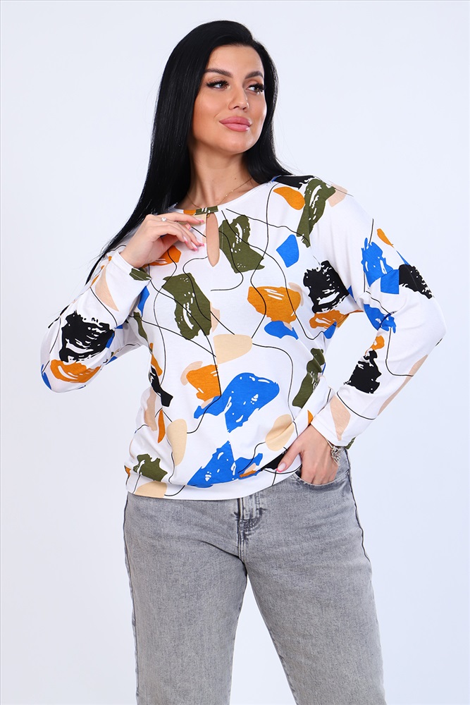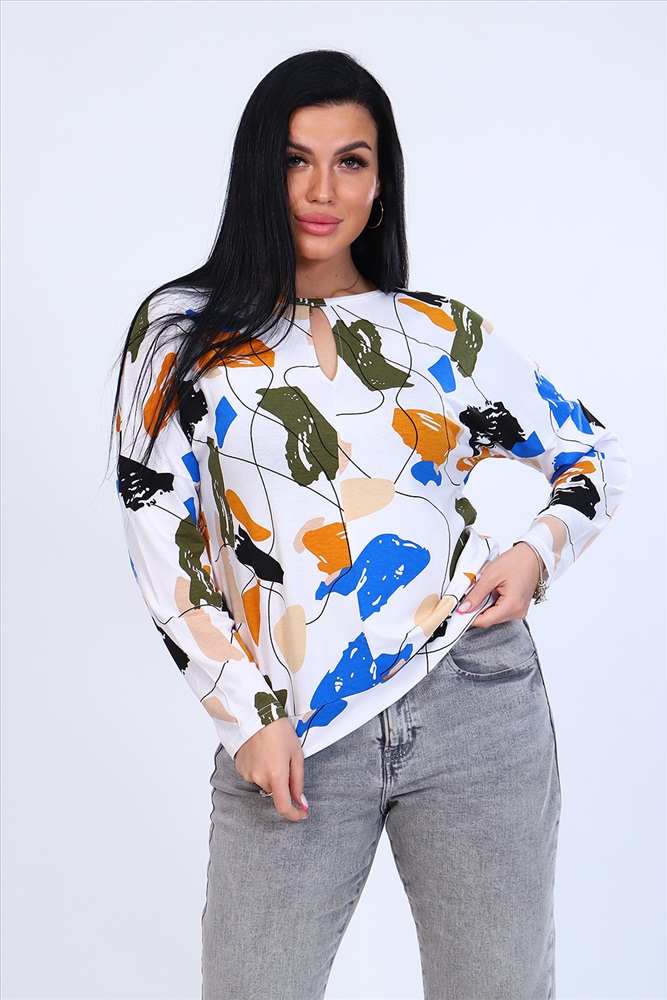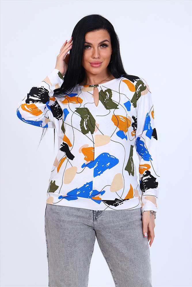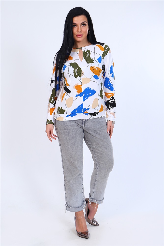 Джемпер женский выполнен из набивной вискозы. Округлая горловина, длинный рукав, спереди вырез в виде капельки. Полочка разрезная, спущенный рукав, низ обработан широкой обтачкой. Оригинальная набивка придает изюминку базовой модели. Комфортный, универсальный джемпер прекрасно впишется в гардероб каждой модницы. Беспроигрышный вариант на любой случай.