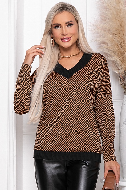 Джемпер из жаккардового трикотажного полотна свободного силуэта с отделкой трикотажной рибаной по V-горловине.