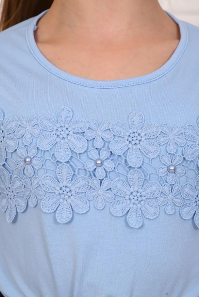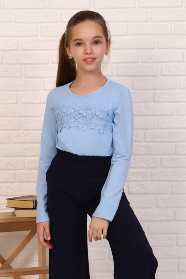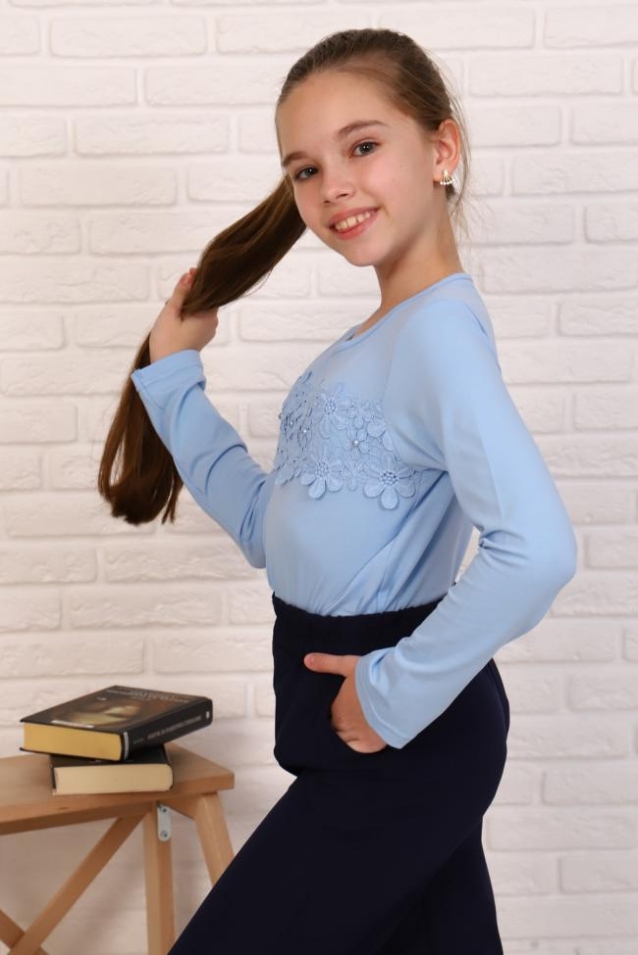 Джемпер для девочек дошкольного, младшего и старшего школьного возраста, из однотонного трикотажного полотна кулирка с лайкрой. Джемпер прямого силуэта, с втачным рукавом, без застежки. Спереди и на спинке отсутствуют линии членения. На передней части джемпера настрочено кружево по линии груди. Срез горловины обработан узкой окантовочной лентой из того же полотна в 4 сложения. Рукав одношовный, длинный. Низ рукава без манжеты, подогнут. На кружево приклеены 3 полубусины.