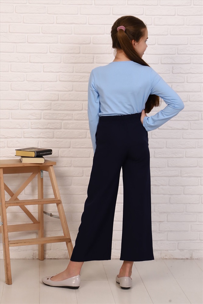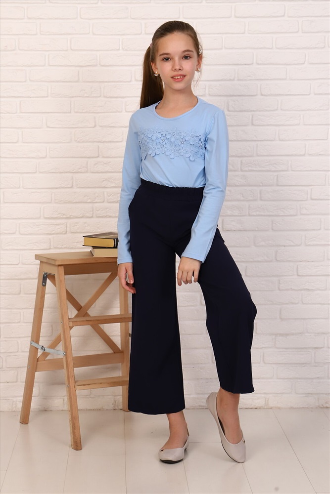 Джемпер для девочек дошкольного, младшего и старшего школьного возраста, из однотонного трикотажного полотна кулирка с лайкрой. Джемпер прямого силуэта, с втачным рукавом, без застежки. Спереди и на спинке отсутствуют линии членения. На передней части джемпера настрочено кружево по линии груди. Срез горловины обработан узкой окантовочной лентой из того же полотна в 4 сложения. Рукав одношовный, длинный. Низ рукава без манжеты, подогнут. На кружево приклеены 3 полубусины.