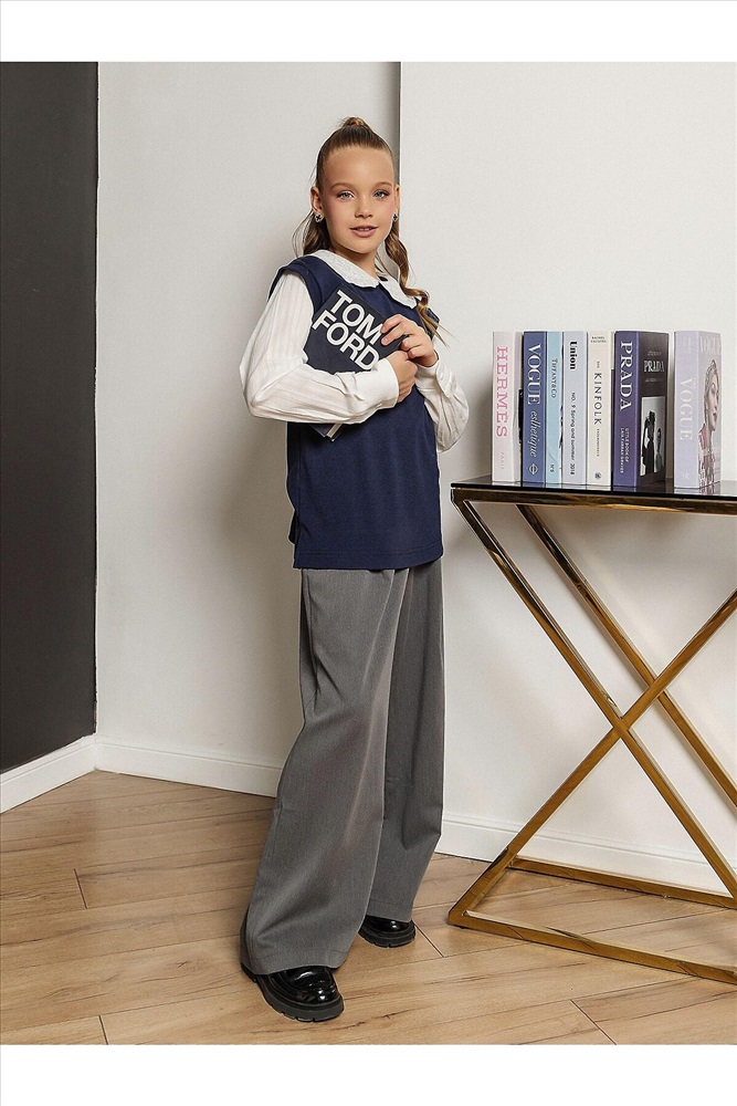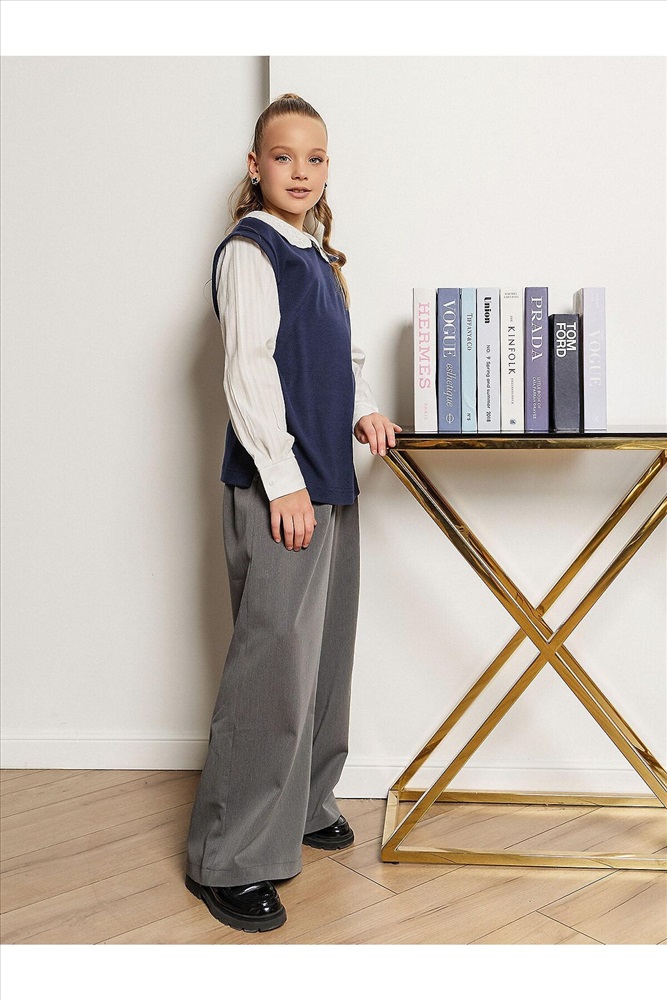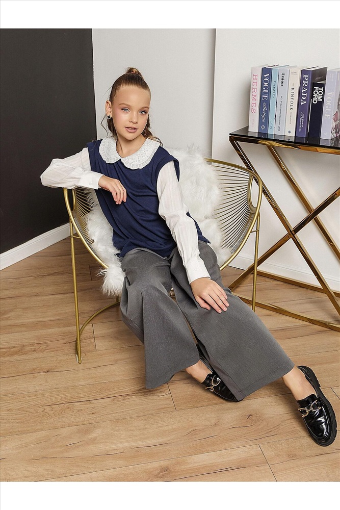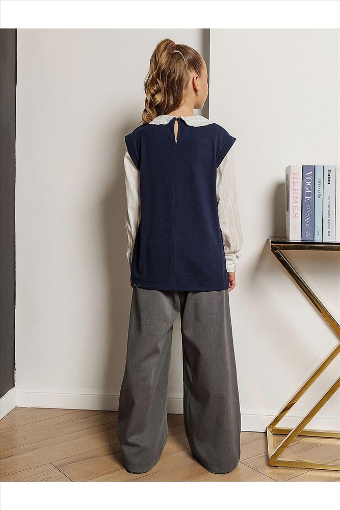Стильная рубашка-обманка в темно-синем цвете имитирует эффект многослойности: сочетает элегантную рубашку и уютный трикотажный жилет в одной модели. Иллюзия двух изделий создает визуально интересный и стильный образ без лишних слоев. Кружевной воротник добавляет изысканности, а длинные рукава с манжетами завершают лаконичный крой. Глубокий темно-синий оттенок делает рубашку универсальной для базового гардероба.