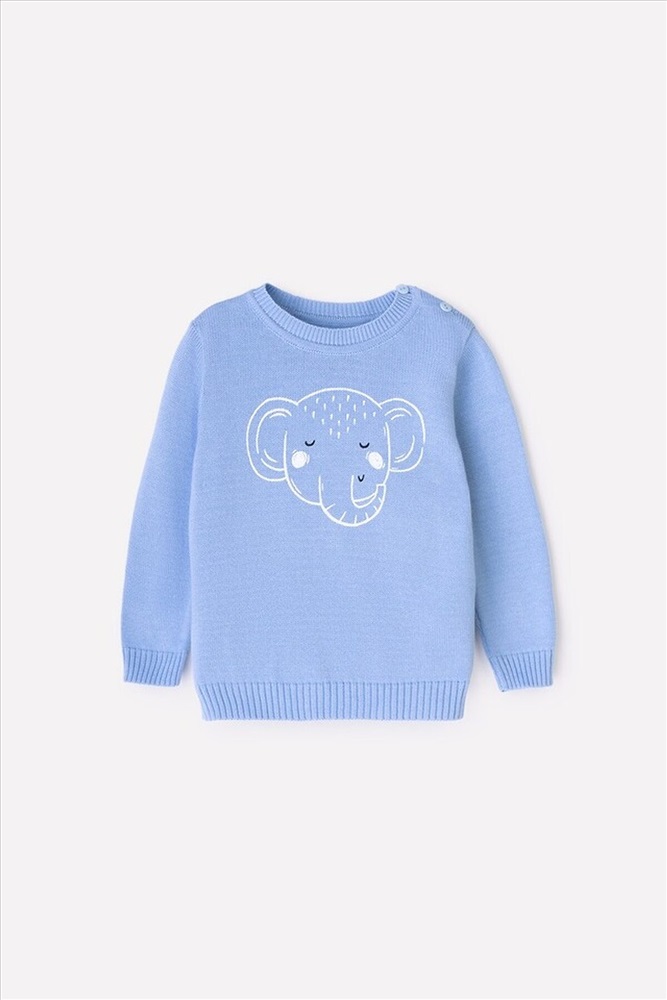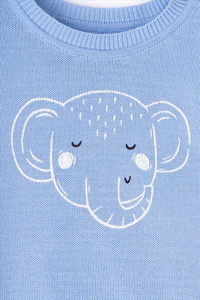 Вязаный джемпер с втачными рукавами. Украшен изображением слонёнка. Связан из хлопковой пряжи. На рукавах эластичные манжеты. Внизу мягкий пояс. Застёгивается на пуговицу.
