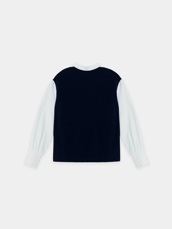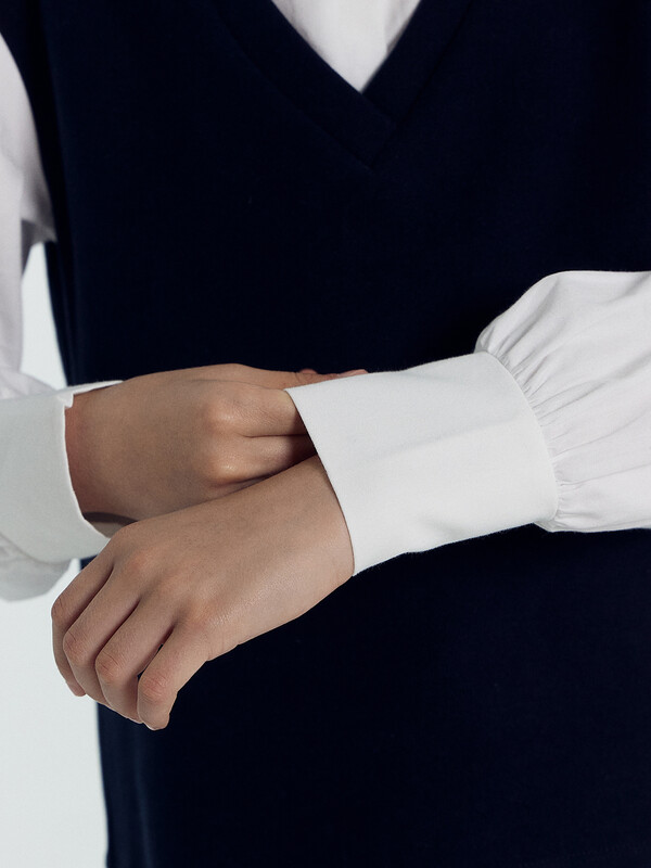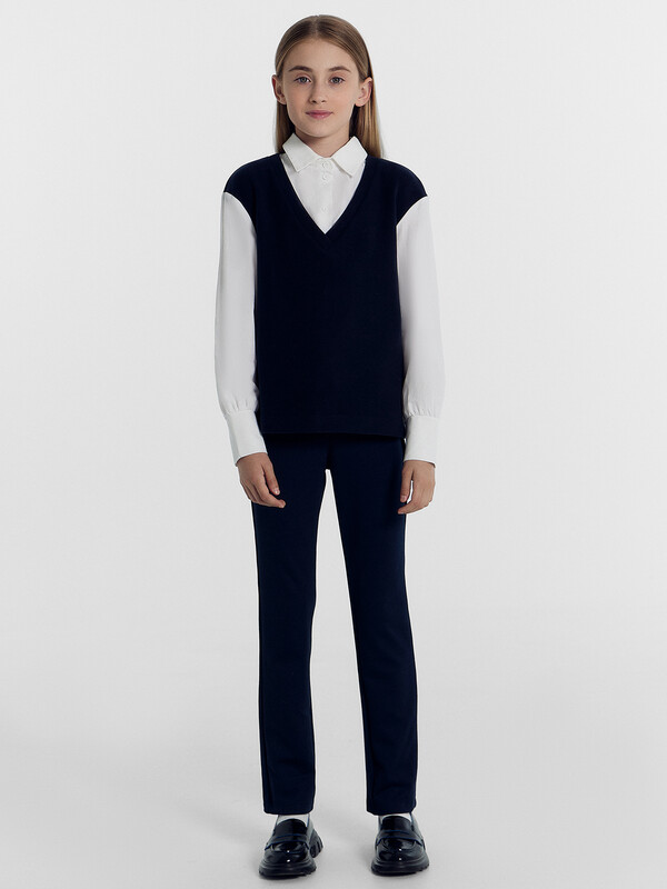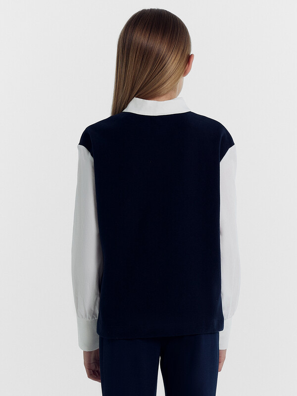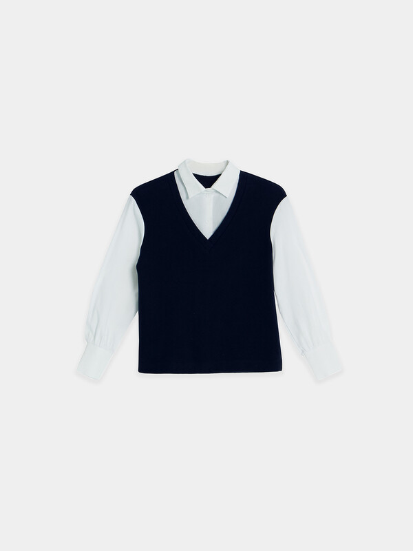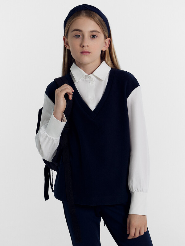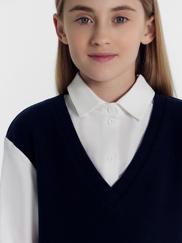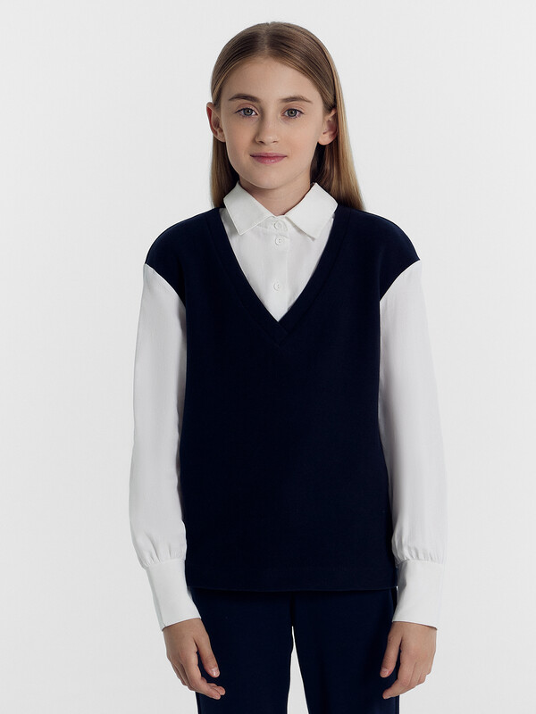 Джемпер свободного силуэта, с имитацией жилетки и рубашки. Жилет из селаника горловина V-образной формы. Рубашка из ткани горловина круглой формы, воротник с цельнокроенной стойкой. По переду центральная застежка на пуговицы. Плечо спущено, пройма углубленна. Рукава втачные, длинные из ткани. Низ рукава немного расширен и присборен, по низу рукава отрезная манжета из ткани. Низ изделия обработан швом в подгибку.