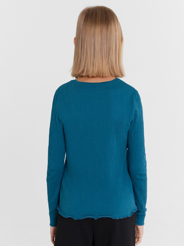 Джемпер прилегающего силуэта. Горловина обработа обтачкой из основного полотна. Рукав втачной длинный. Низ изделия и рукавов обработан микрооверлоком.