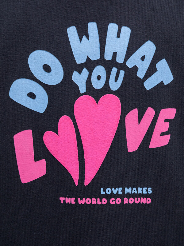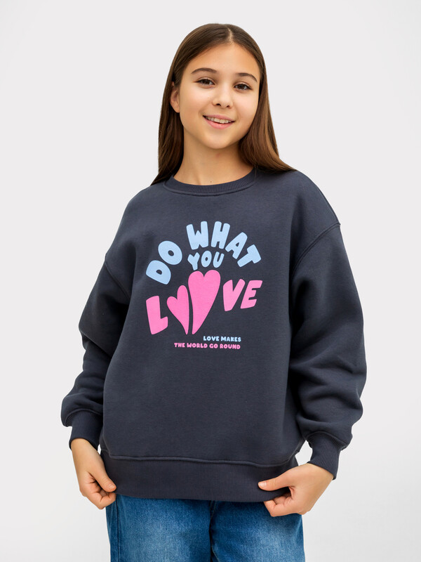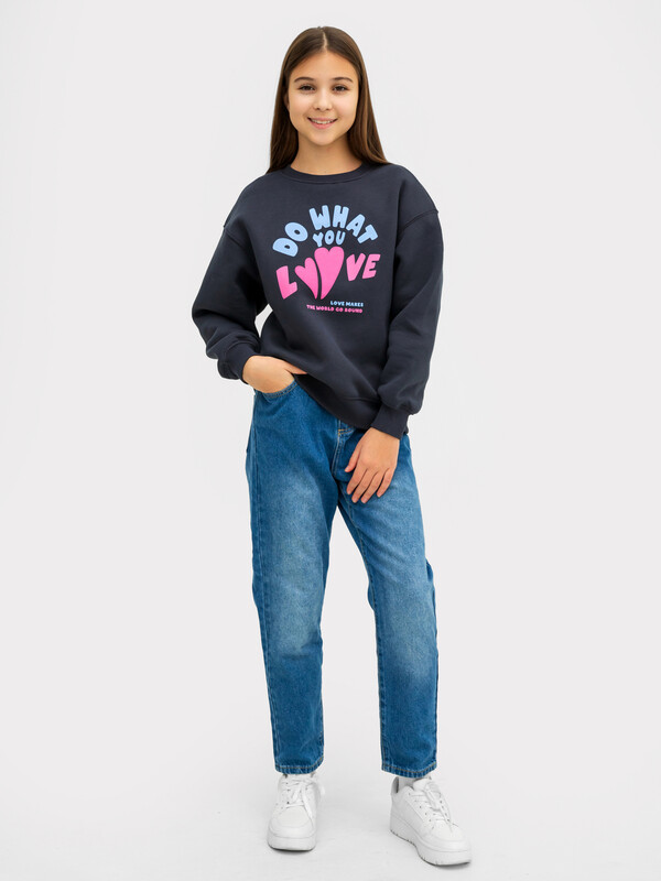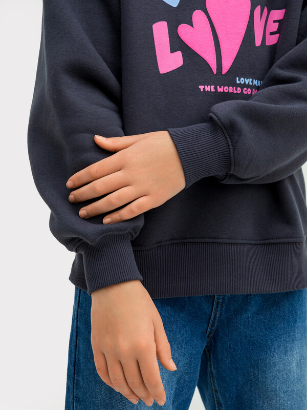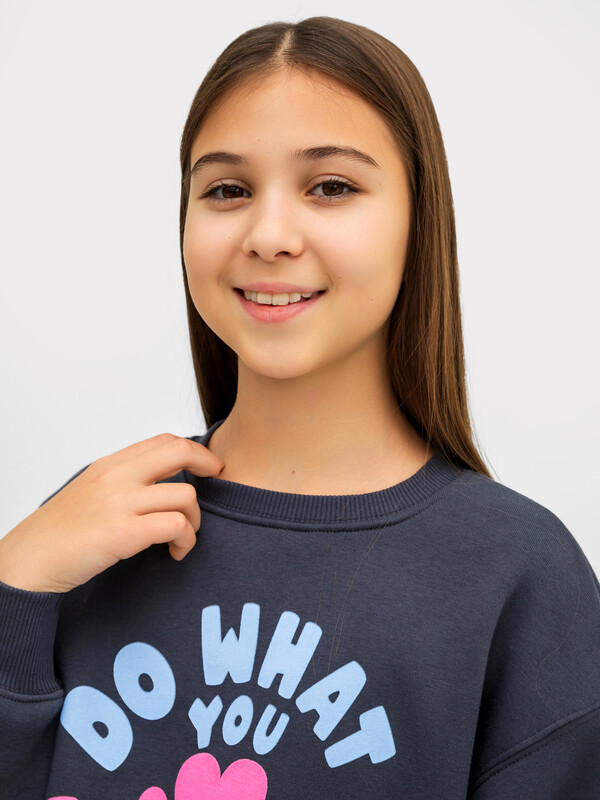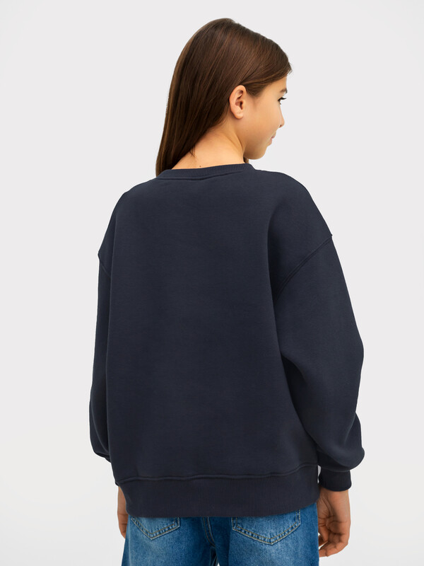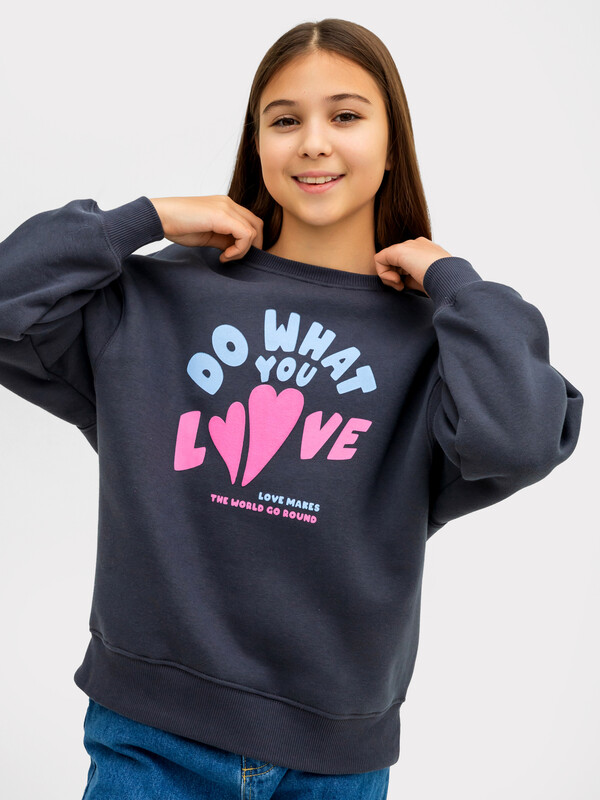Джемпер свободного силуэта. Рукава длинные, втачные. Линия плеча спущена. Перед и спинка цельнокроенные. Горловина круглой формы обработана обтачкой из рибаны. Шов притачивания обтачки распошит. По низу рукавов и джемпера притачены манжеты и пояс из рибаны.