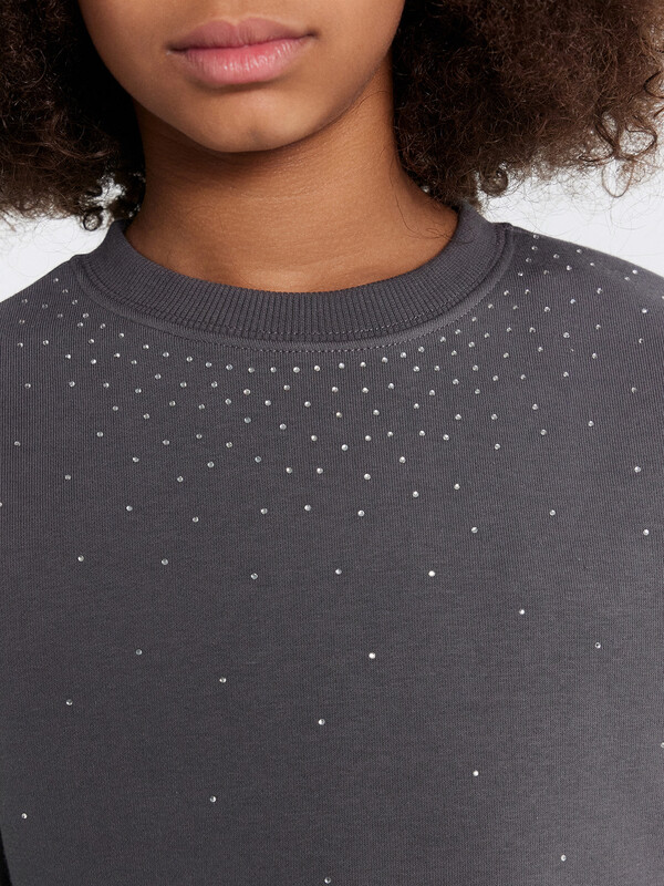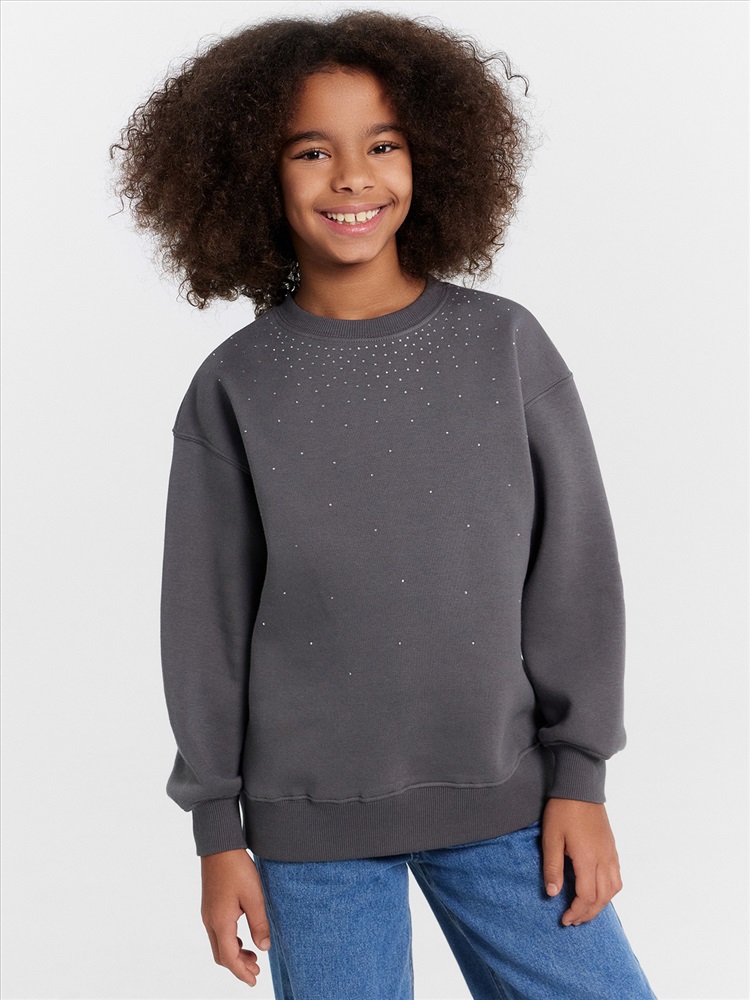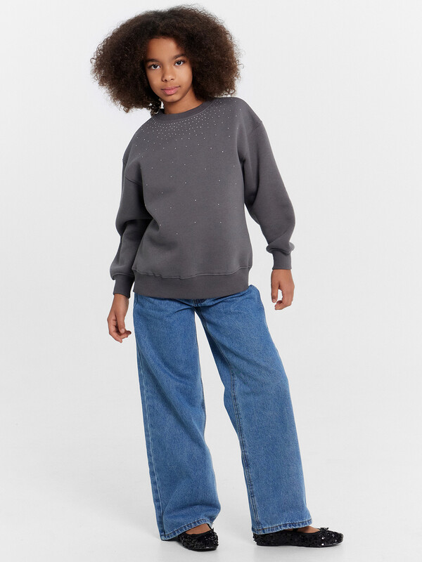 Джемпер свободного силуэта. Рукава длинные, втачные. Линия плеча спущена. Перед и спинка цельнокроенные. Горловина круглой формы обработана обтачкой из рибаны. Шов притачивания обтачки распошит. По низу рукавов и джемпера притачены манжеты и пояс из рибаны.