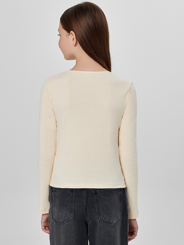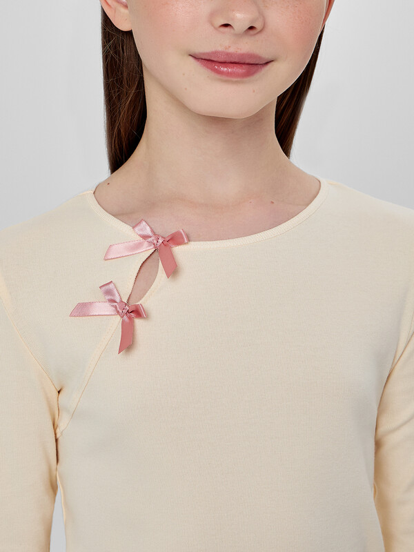 Украшением модели служит декоративный вырез на передней части, дополненный нашитыми бантиками, которые добавляют образу нежности и милого шарма. Длинные рукава и низ изделия обработаны мягким швом, который не раздражает кожу и обеспечивает аккуратную посадку.