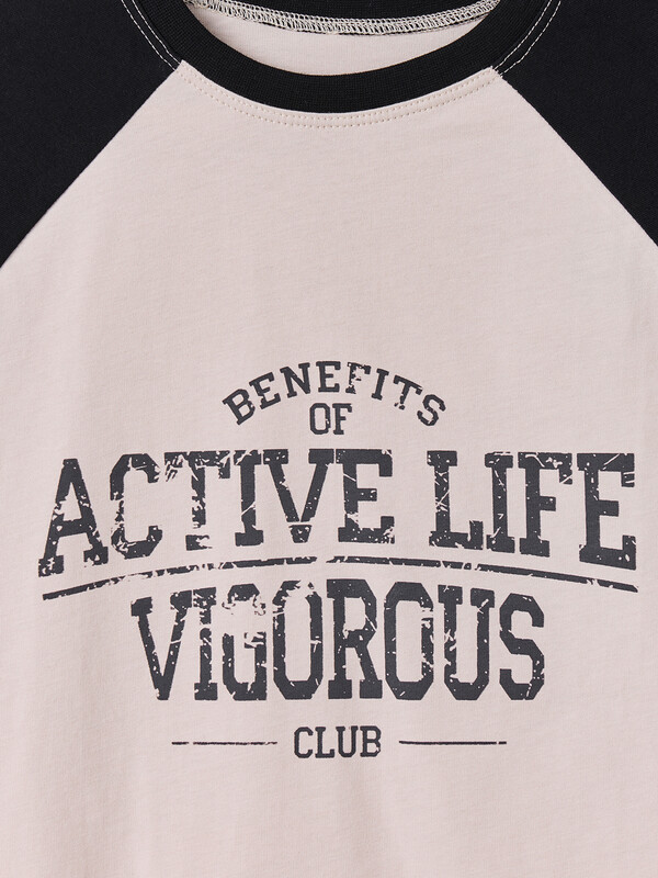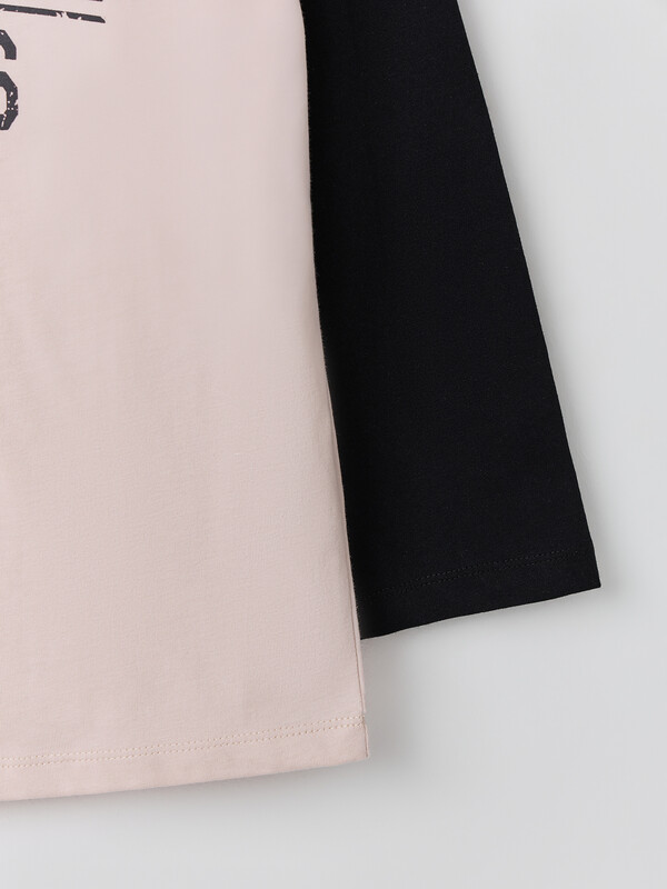 обтачка из трикотажного полотна рибаны 2*2. По горловине отделочная строчка. Нижний срез рукавов и футболки застрочен швом в подгибку на двухигольной плоскошовной машине.