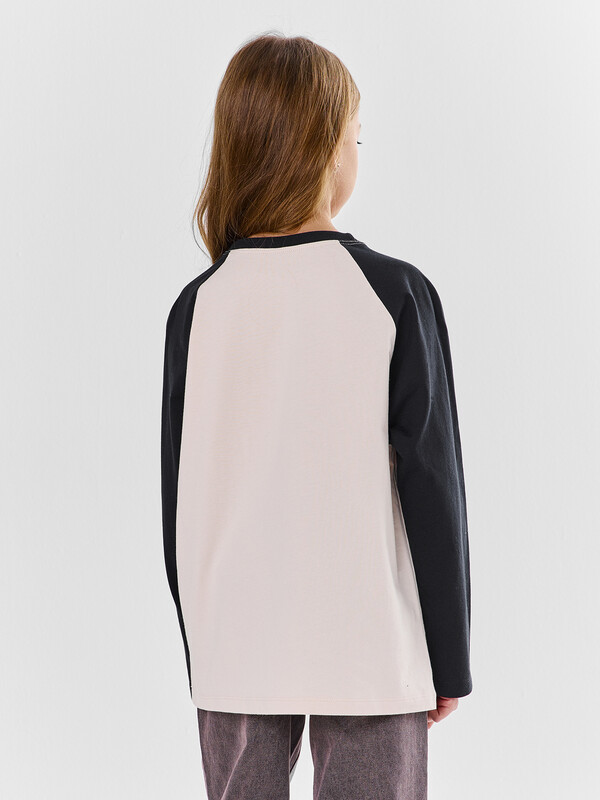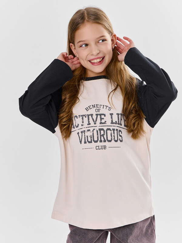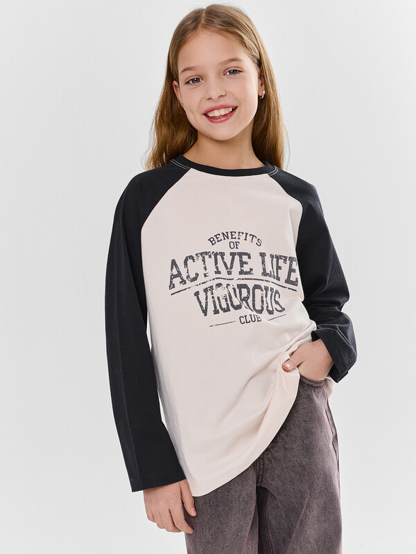 Джемпер для девочек свободного силуэта. Рукава длинные, реглан. Горловина круглой формы,