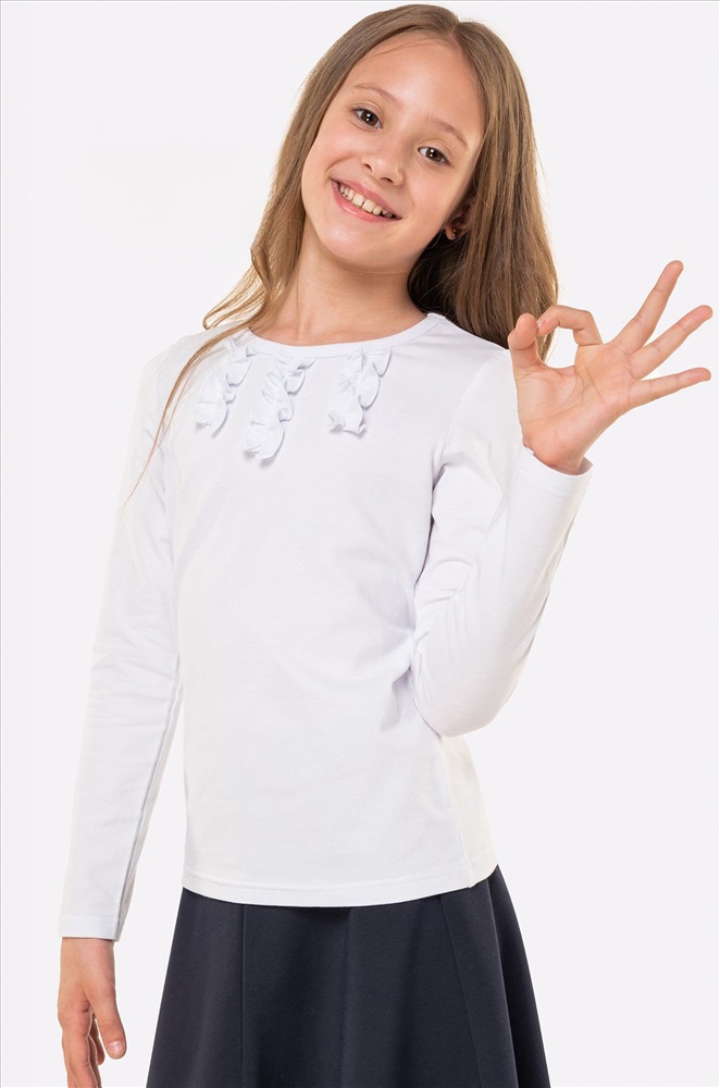 Детский лонгслив из легкого трикотажа станет идеальным дополнением к школьной форме для девочек и девочек-подростков. Аккуратные рюши, длинный рукав и базовый белый цвет – важные детали, которые делают лонг для детей красивым и опрятным. Подростковая модель выполнена из мягкой ткани с высоким содержанием хлопка. Кулирная гладь отлично пропускает воздух. Благодаря лайкре в составе демисезонный белый лонг отлично тянется. Однотонный лонгслив не сковывает движений и дарит комфорт. Мягкая горловина не сдавливает шею, а длинные рукава нежно облегают руки и согревают в прохладную погоду. Нарядный лонг поможет создать деловой образ для повседневных прогулок и торжественных мероприятий. Хлопковый лонгслив станет отличным решением для праздников. Модель Варвара, рост 148 см, параметры: 69-57-73 см. На ней лонгслив 146 размера.