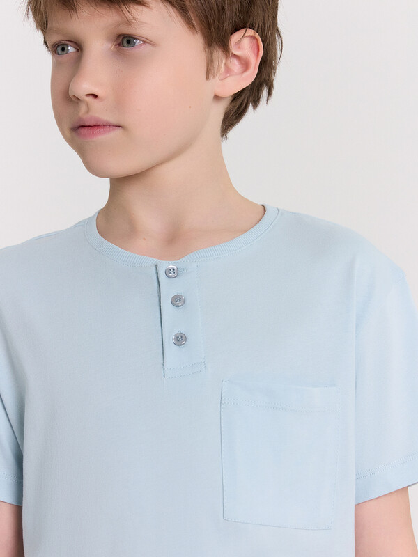 Спинка и перед цельнокроенные. По переду обработана застежка на 2 петли и пуговицы (d=10мм). Отрезная воротник-стойка из рибаны. Рукава короткие, втачные.
