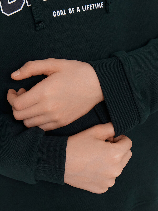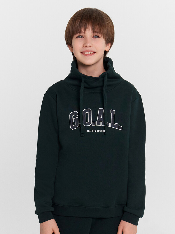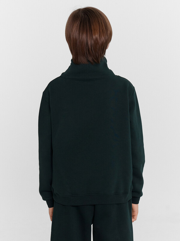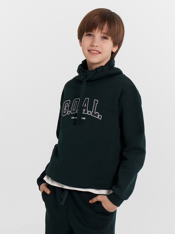 Джемпер для мальчиков, выполненный из утепленного трикотажного футера с нежным подчесом. Отрезные манжеты на длинных рукавах и пояс созданы из рибаны. Силуэт джемпера прямой, длина – до бедер. Итересной особенностью модели является воротник, выполненный в виде хомута со шнурком. Необычно, комфортно, стильно!
