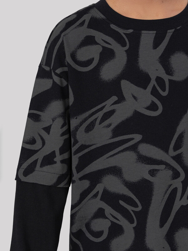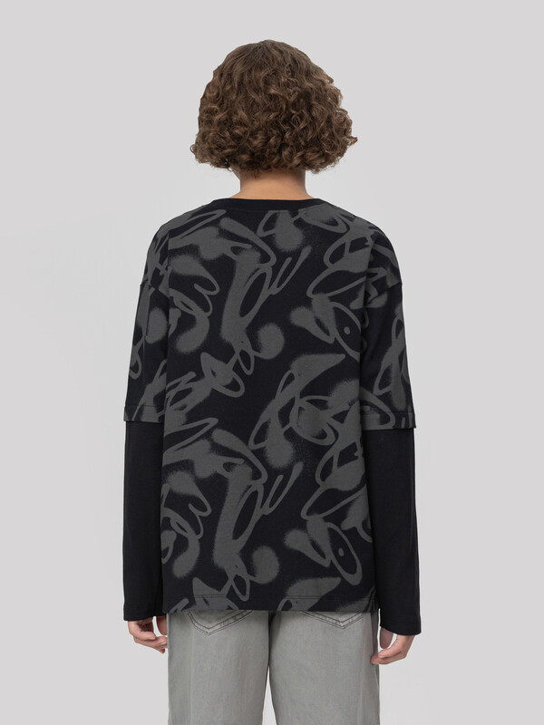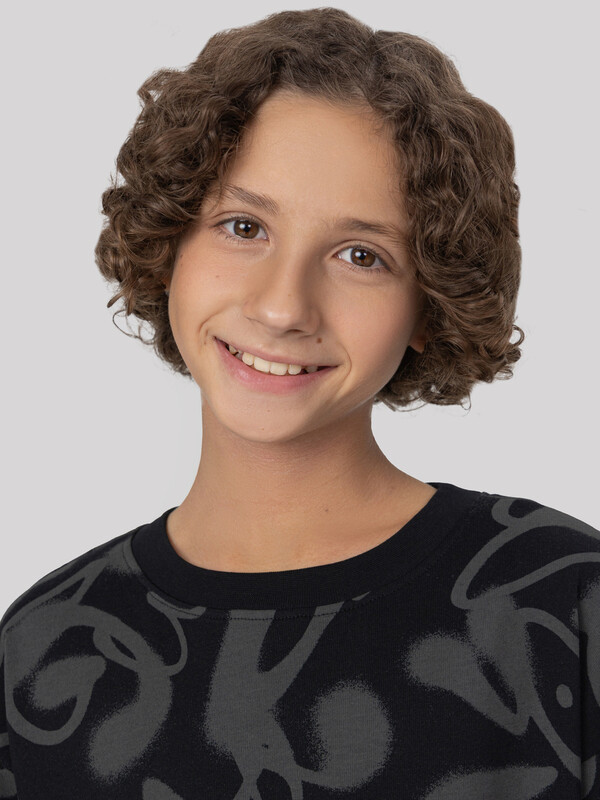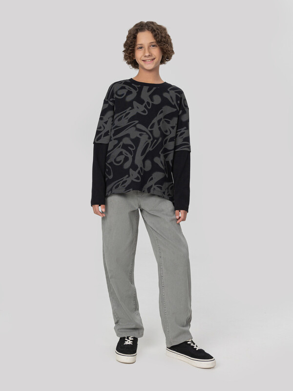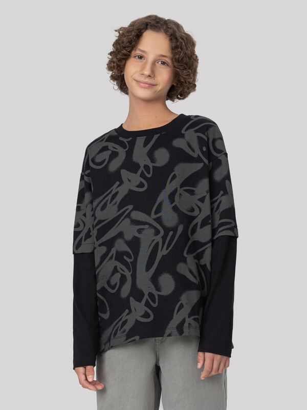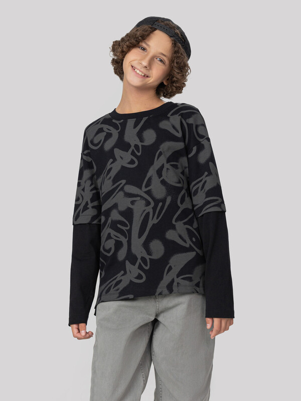 Джемпер для мальчиков свободного силуэта. Рукава втачные. Низ рукавов обработан швом вподгибку. Горловина круглой формы, обтачка из рибаны. По боковым швам разрезы, спинка длинее переда. Низ джемпера обработан швом вподгибку.