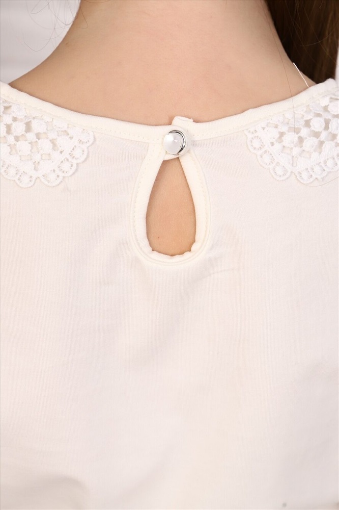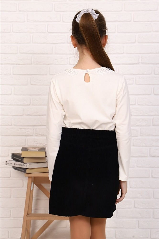 Страна производства: Россия Джемпер для девочек младшего и старшего школьного возраста, из трикотажного однотонного полотна кулирка с лайкрой. Джемпер полуприлегающего силуэта, с втачным длинным рукавом, с кружевным воротником, с центральной застежкой на петлю и пуговицу на спинке. Спереди отсутствуют линии членения. На спинке вырез в виде капельки. Срез горловины и капля окантованы. Рукав одношовный. Низа рукава и изделия подогнуты. Спереди по центру горловины прикреплен декоративный элемент.
