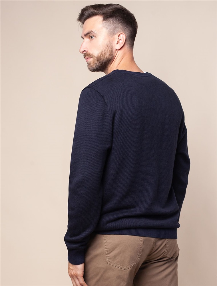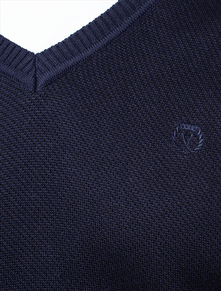 Состав: 55%Хлопок 45%ПАН (акрил); Параметры модели на первом фото: Рост 190, бюст 111, талия 88, бедра 105 Для изготовления синего джемпера с клиновидным вырезом и длинными рукавами использовали пряжу из премиального хлопка с акрилом. У модели получилась очень мягкая и приятная на ощупь фактура из переплетения нитей нескольких цветов. Изделие комфортно носить даже на голое тело или дополнив образ футболкой. Роскоши вносит вышитый логотип бренда.