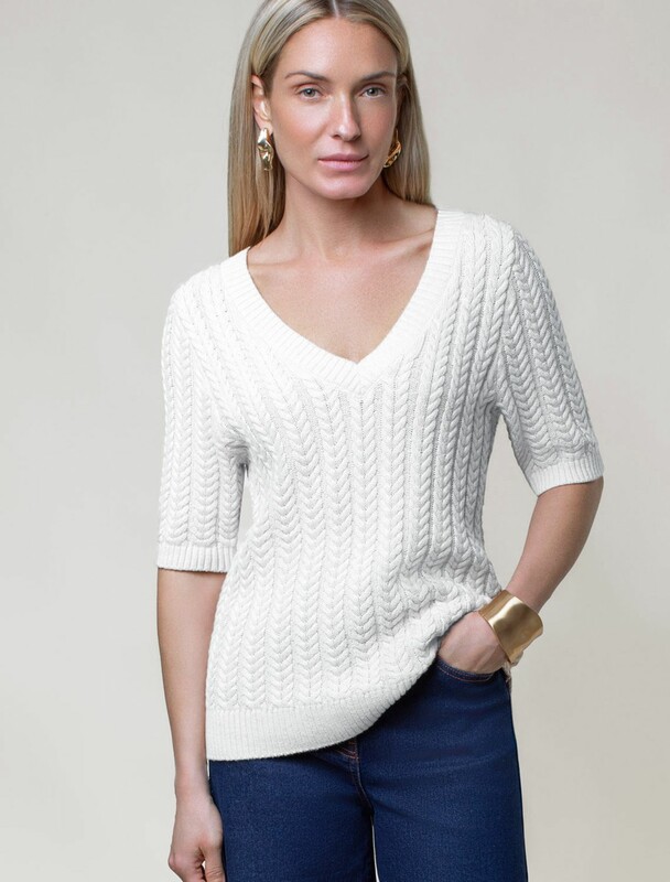 Производитель: Vilatte Джемпер фактурной вязки выполнен из хлопка с добавлением кашемира. Модель с V-вырезом с вывязанным орнаментом цепи. Мягкая и очень приятная пряжа совершенно не колется, сохраняет тепло при этом не перегревая, гарантируя безупречный комфорт.