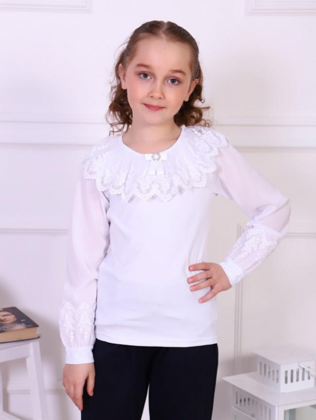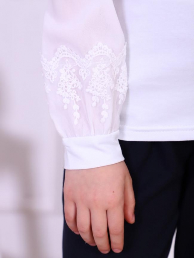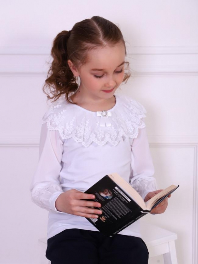 Джемпер для девочек с длинным рукавом. Данная модель станет основой школьного или праздничного образа. Элегантное мягкое кружево на горловине можно красиво разложить на сарафан или пиджак, что создаст нарядный look. Оригинальная модель добавит романтизма в образ и подчеркнет индивидуальность, можно сочетать с юбкой, сарафаном и брюками. Шифоновые рукава на манжете, по низу настрочено кружево. На спинке вырез в виде капли с застежкой на петлю и пуговицу. Джемпер сшит из качественного трикотажа - кулирка с лайкрой, используемый материал не теряет форму после многократных стирок, мягкий и приятный к телу, устойчив к износу. Для сохранения первоначальных свойств изделия, важно соблюдать рекомендации по уходу.