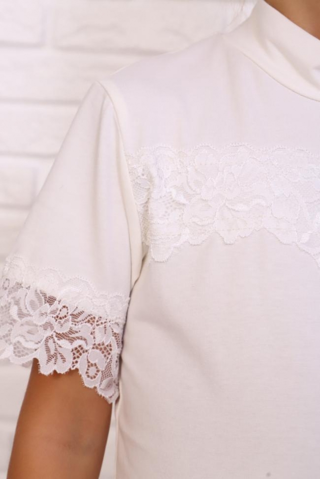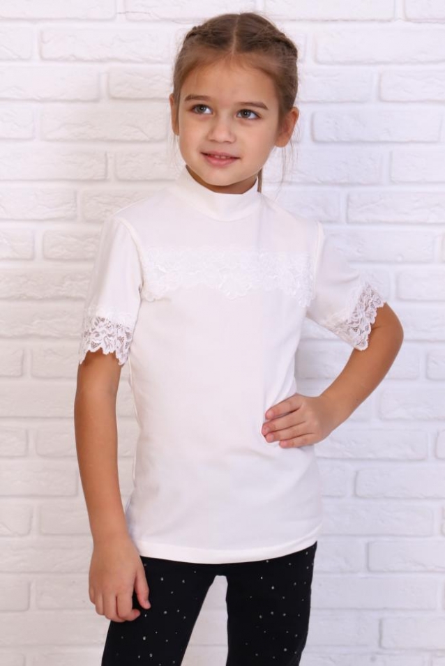 Школьный джемпер для девочки с коротким рукавом. Мягкая трикотажная ткань и нежное кружево на рукавах и по переду изделия делают её универсальной - подходящей как для повседневной носки, так и для праздничных мероприятий. Узорчатый, полупрозрачный гипюр придаёт шарм этой модели. Модель составит одинаково удачный комплект и с юбкой, и с брюками. Воротник-стойка, несмотря на отсутствие застежки, хорошо тянется. Джемпер сшит из качественного трикотажа, используемый материал не теряет форму после многократных стирок, мягкий и приятный к телу, устойчив к износу. Для сохранения первоначальных свойств изделия, важно соблюдать рекомендации по уходу.