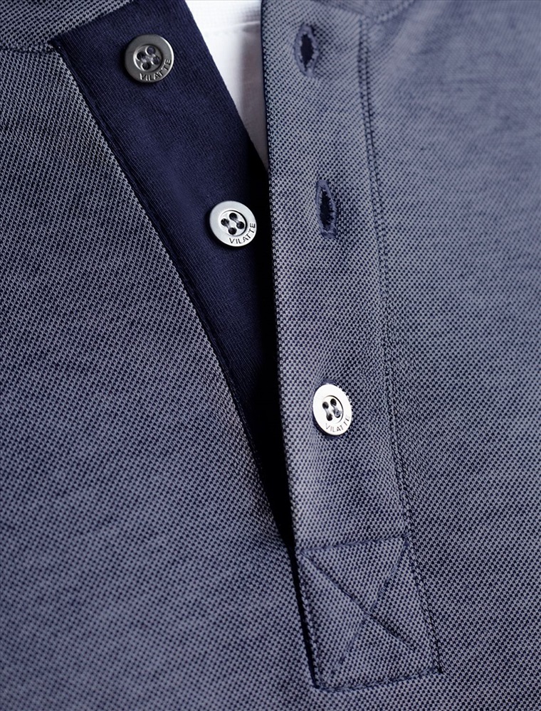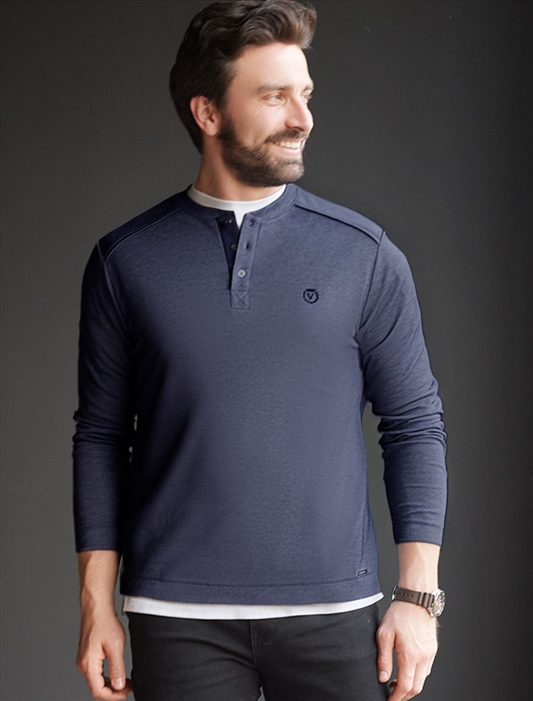 Джемпер хенли темно-синего цвета из полотна пике, состоящий из двух оттенков нити, создающем эффект меланж. Мягкая и дышащая ткань обеспечивает комфорт в течение всего дня, позволяя коже дышать и поддерживать оптимальную воздухопроницаемость. Материал тянется, обеспечивает долговечность и сохраняет презентабельный внешний вид даже после многократных стирок.
