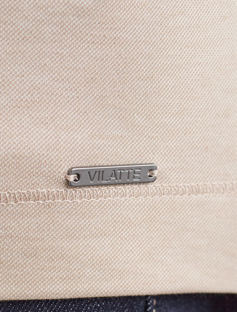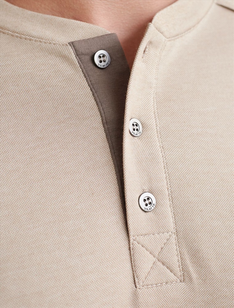 Джемпер хенли темно-бежевого цвета из полотна пике, состоящий из двух оттенков нити, создающем эффект меланж. Мягкая и дышащая ткань обеспечивает комфорт в течение всего дня, позволяя коже дышать и поддерживать оптимальную воздухопроницаемость. Материал тянется, обеспечивает долговечность и сохраняет презентабельный внешний вид даже после многократных стирок.