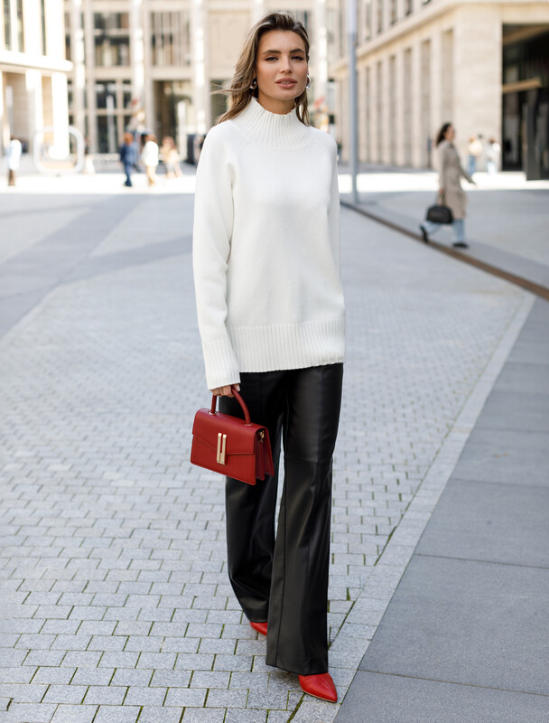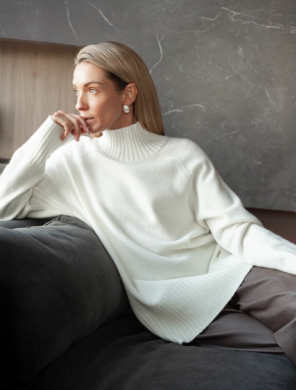 Джемпер с воротом стойка выполнен из мягкой пряжи с кашемиром. Модель свободного силуэта с рукавом реглан будет стильно сочетается с брюками и джинсами. Мягкая пряжа очень приятная к телу, поддержит комфорт на протяжении всего дня, при этом не перегревая. Сочетается в костюме с брюками D38.013, D38.012 и юбкой D36.016