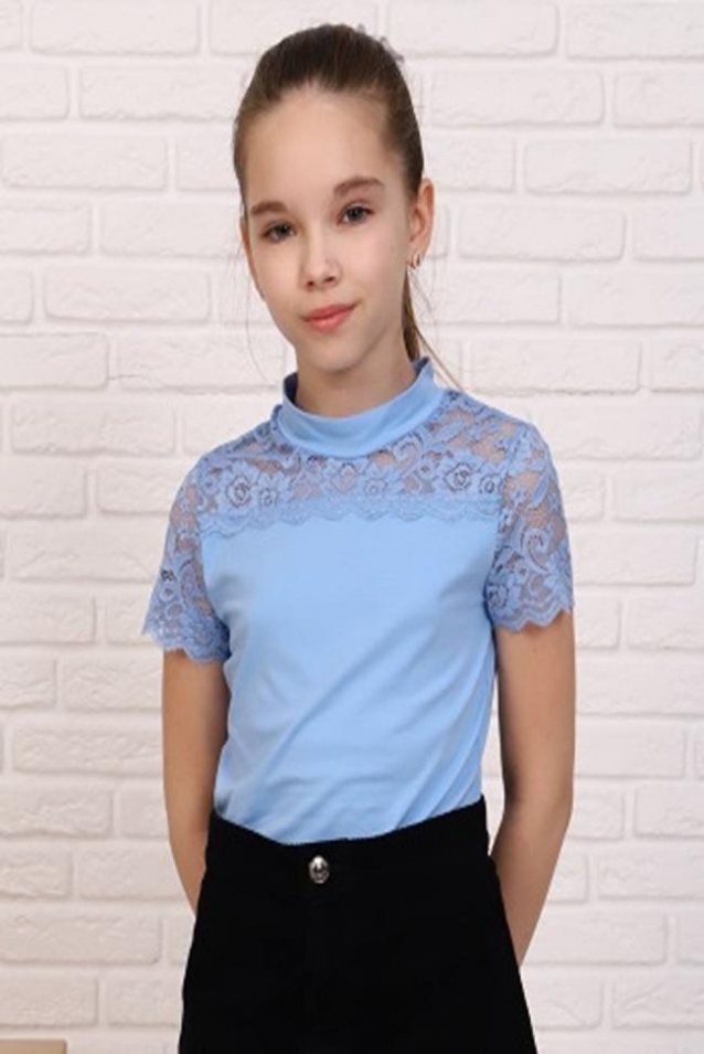 Джемпер для девочек младшего и старшего школьного возраста, из трикотажного однотонного полотна кулирка с лайкрой и эластичного кружева ( дизайн и ширина кружева может меняться). Джемпер полуприлегающего силуэта, с втачным коротким рукавом, с воротником стойкой. Спереди отрезная кружевная кокетка. На спинке отсутствуют линии членения. Рукав одношовный, выполнен из эластичного кружева. Низ изделия подогнут.