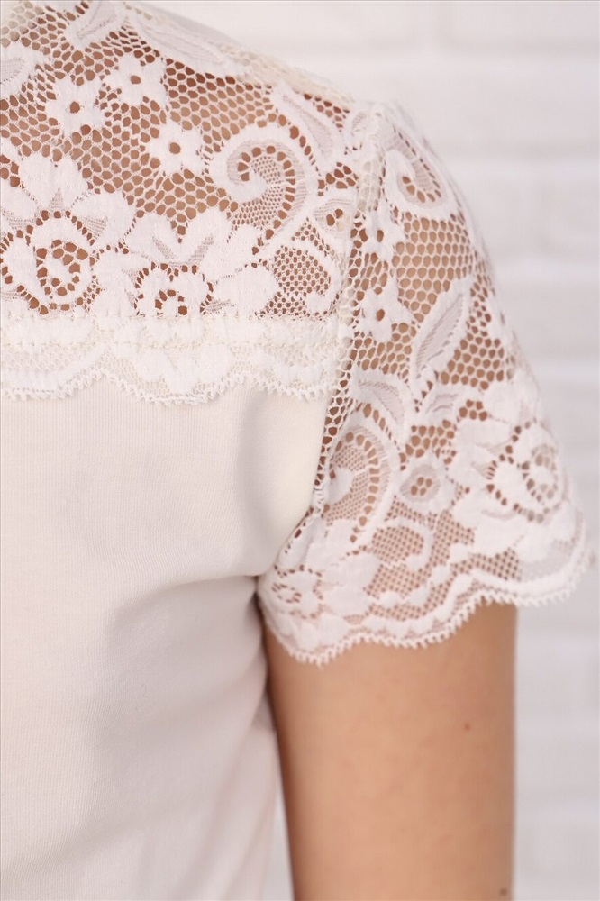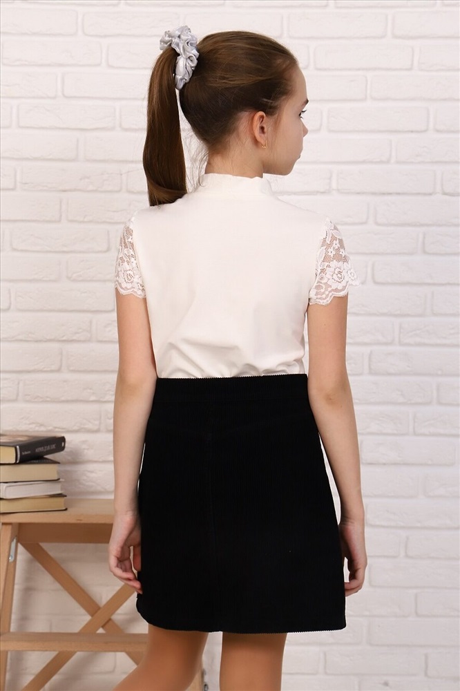 Страна производства: Россия Джемпер для девочек младшего и старшего школьного возраста, из трикотажного однотонного полотна кулирка с лайкрой и эластичного кружева ( дизайн и ширина кружева может меняться). Джемпер полуприлегающего силуэта, с втачным коротким рукавом, с воротником стойкой. Спереди отрезная кружевная кокетка. На спинке отсутствуют линии членения. Рукав одношовный, выполнен из эластичного кружева. Низ изделия подогнут.