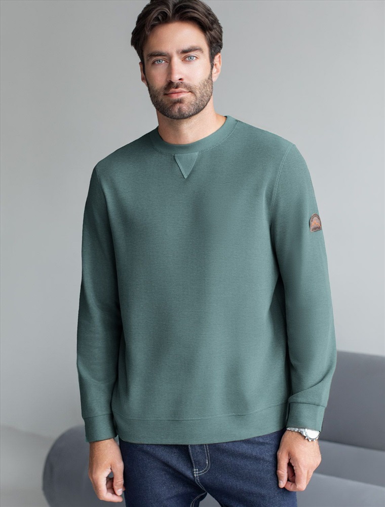 Легкий и невероятно комфортный джемпер изумрудного цвета создан для повседневного образа. Мягкий фактурный эластичный трикотаж приятно ощущается на теле, не сковывает движения и отлично подходит для носки в любое время года. Полуприлегающий крой обеспечивает свободу и удобство, позволяя выглядеть стильно и чувствовать себя уверенно каждый день. Круглый ворот украшен декоративной нашивкой в виде перевернутого треугольника, добавляющей оригинальности.. Манжеты на рукавах и по низу аккуратно оформлены, что придает завершенность внешнему виду и способствует сохранению формы джемпера после длительной носки и многочисленных стирок. На груди нашивка из экокожи в виде логотипа бренда, подчеркивающая индивидуальность каждого мужчины.
